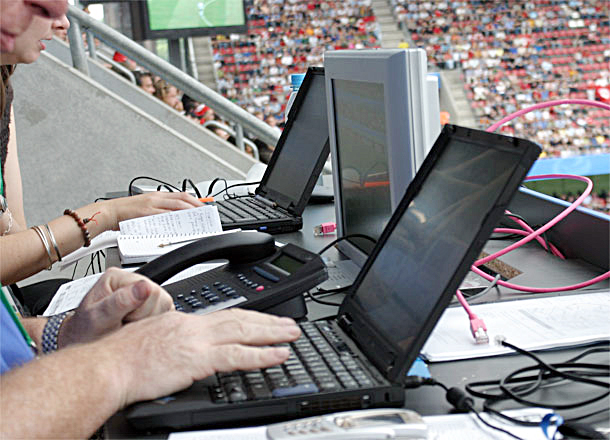 Dazu sagt Udo Großcappenberg, Projektkoordinator bei T-Systems: »Die Anforderungen sind hoch. Die Fifa erwartet von uns zum Beispiel Dienstleistungen zu Daten- und Sprachnetzen in einer Qualität, die sogar die Anforderungen von Kunden aus der Wirtschaft übersteigt«. 99,9 Prozent beträgt demnach die vertraglich vereinbarte Verfügbarkeit, in der das gesamte Organisationsteam und sämtliche Fifa-Mitarbeiter über die Hochgeschwindigkeitsnetze auf Daten verschiedener Programme zugreifen können müssen. Neben den Tests im Vorfeld soll ein gesicherter Betrieb den reibungslosen Einsatz der Systeme garantieren. Gemeinsam mit dem Event-Information-System, das sämtliche Informationen zum eigentlichen Spielbetrieb verwaltet, betreibt T-Systems die Lösungen auf mehr als 25 Servern in einem der Hochsicherheits-Rechenzentren des Unternehmens. Weiter laufen in München während der WM alle technischen Anfragen aus den Stadien und auch von anderen Standorten ein. Auf Großbildschirmen überwachen und steuern die Mitarbeiter von T-Systems das Netz und sollen so dafür sorgen, dass im Problemfall sofort ein Experte vor Ort ist. So werden während der WM allein von T-Systems rund 130 Mitarbeiter pro Stadion und Spiel für die Fifa unterwegs sein.