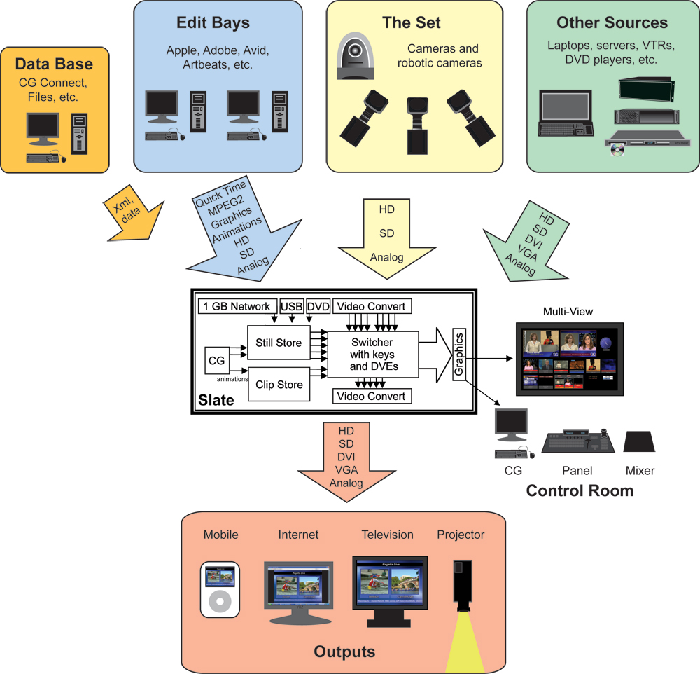 Herzstück des neuen Nachrichtenstudios ist die Komplettlösung Slate 2100 von Broadcast Pix, die von den Firmen Videocation aus München und Cam aus Köln installiert wurde. Mit Slate lassen sich mehrere Bildquellen steuern, Texte, Grafiken und Animationen einblenden und über eine integrierte Schnittstelle auch externe Kameras fernsteuern. Mit einem integrierten Multiviewer ist es möglich, alle Quellen zu überwachen.