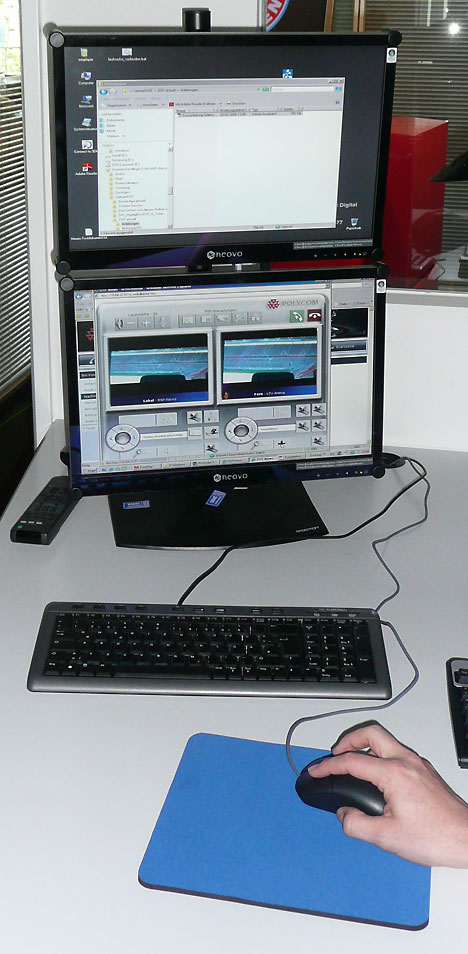 Eine kostengünstige Methode, um Schaltungen zu anderen Standorten zu realisieren, stellt das HD-Videokonferenzsystem Polycom HDX9004 dar, das die Firma AVN für den Sportsender installiert hat. »Das System arbeitet mit einem sehr guten Codec«, so Stefan Wistuba, »und damit ist es möglich, via IP mit einer sehr geringen Bandbreite zu anderen Standorten zu schalten und Bild und Ton von unseren Gegenstellen in die News aufzunehmen. «