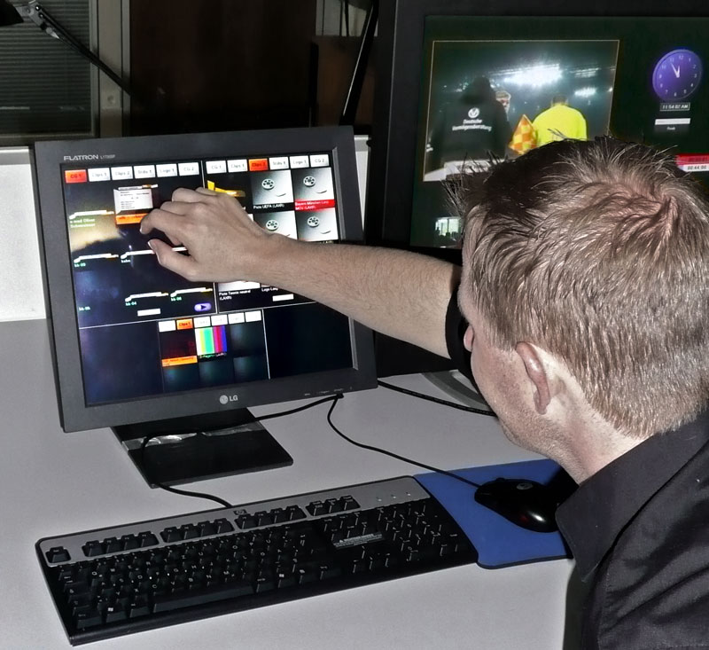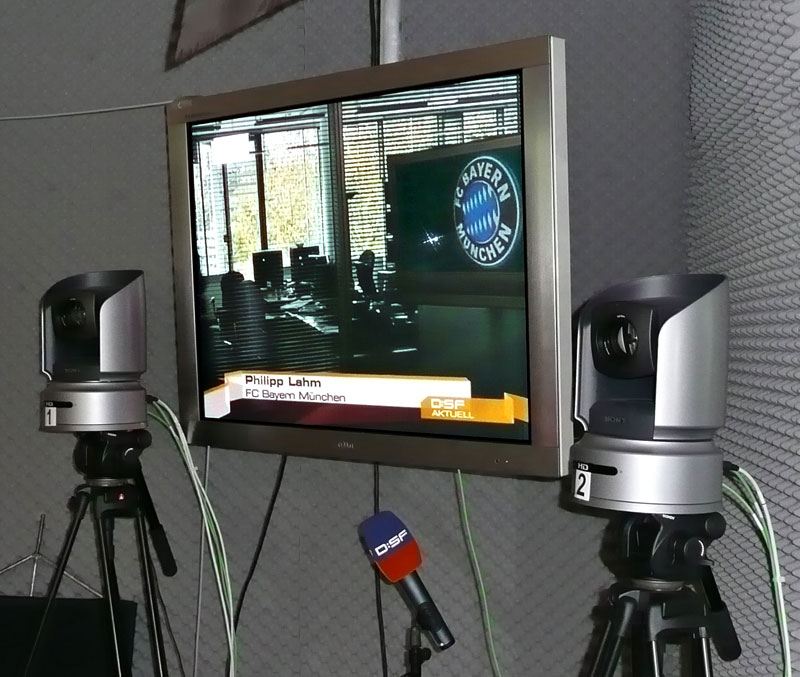 Stefan Wistuba, Leiter Produktionsplanung bei DSF, plante und überwachte die Integration und Installation. »Für uns bietet das System enorme Vorteile, weil wir es aufgrund der eingesetzten IT-Technik sehr flexibel planen und genauso zusammenstellen konnten, wie wir es haben wollten. Das beginnt schon bei der Bedienung: Die ist sowohl per Touchscreen wie auch übers Panel möglich. Besonders interessant ist für uns auch die Panel-Steuerung der Studiokameras. Damit können wir unsere beiden Roboterkameras im Studio bequem fernsteuern und kommen so mit nur einem Operator fürs Bild und einem weiteren für Ton und Grafik aus, um die komplette Sendung zu fahren«, erläutert Wistuba. Bei den Kameras fiel die Wahl auf das Modell BRC-H700P von Sony, eine komplett fernsteuerbare Dome-Kamera. Einer der Gründe dafür war die Weitwinkeloptik dieser Kamera, die für den Einsatz im kleinen Moderatorenstudio natürlich günstig ist und auch einen größeren Raumeindruck vermittelt.