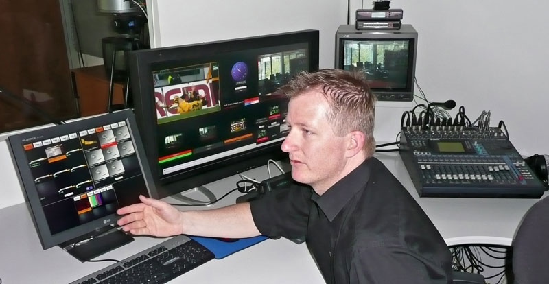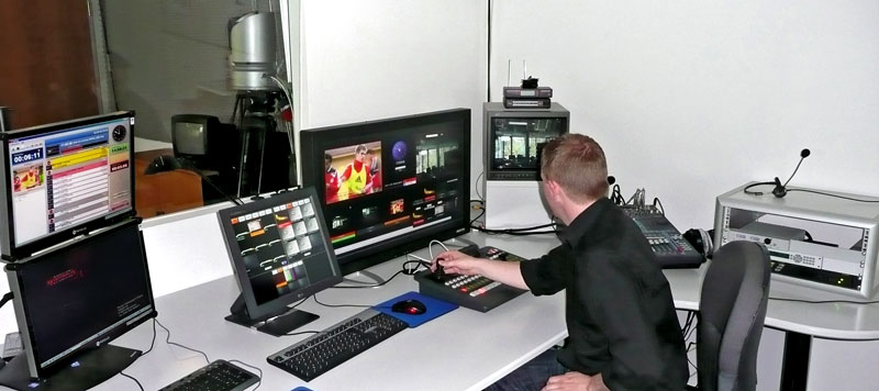 »Die Flexibilität war ein wichtiger Aspekt bei unserer Entscheidung für das kleine eigene Studio. Das fängt schon beim Personal an: In einer »normalen« Regie braucht man fünf technische Mitarbeiter, um eine Sendung wie »DSF aktuell« zu fahren. Die sitzen aber in keiner Produktionsfirma einfach nur rum und warten, ob etwas Aktuelles passiert, man muss also vorplanen, disponieren und bei unplanbaren Ereignissen auch warten, bis eine Regie frei ist und dann alle fünf notwenigen Mitarbeiter da sind. Für unser kleines, einfaches Studio brauchen wir nur zwei technische Mitarbeiter — im absoluten Notfall reicht sogar einer. Außerdem ist die Bedienung so, dass man sie relativ rasch erlernen kann, wir haben also mehrere Mitarbeiter, die normalerweise andere Aufgaben haben, aber auch das kleine Studio fahren können – und sind dadurch in der Lage, sehr viel rascher zu reagieren«, erläutert Manfred Eisele.