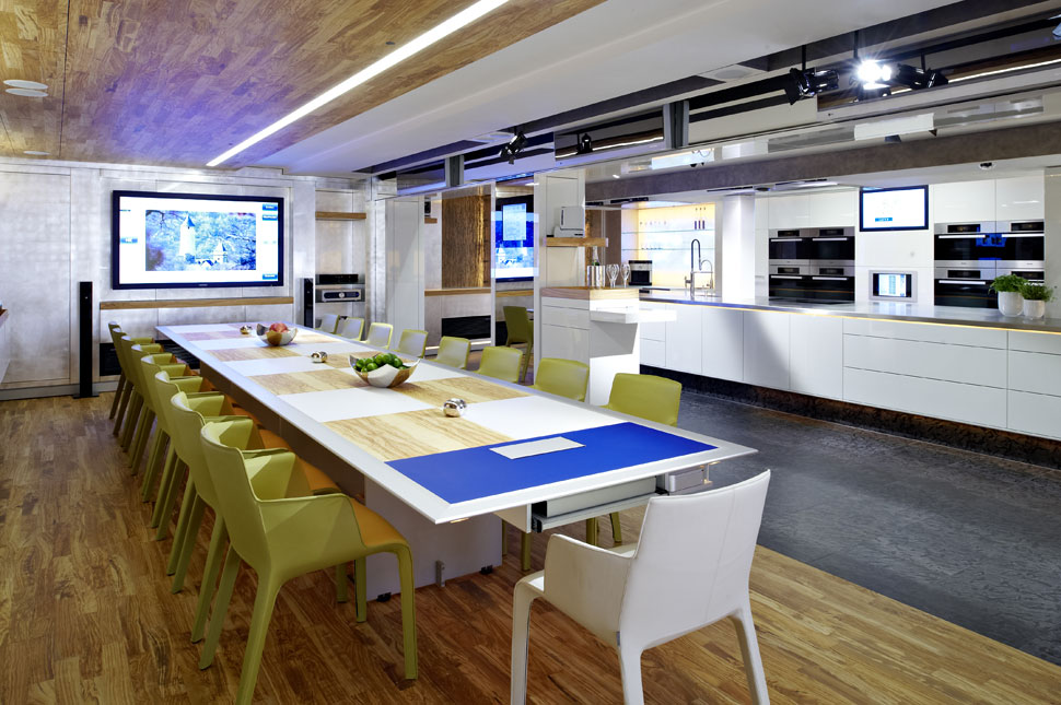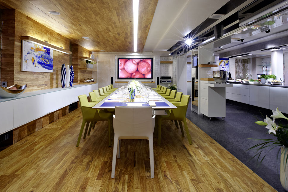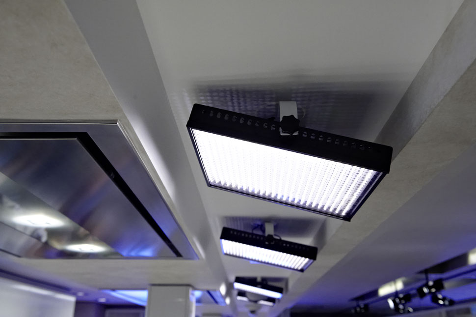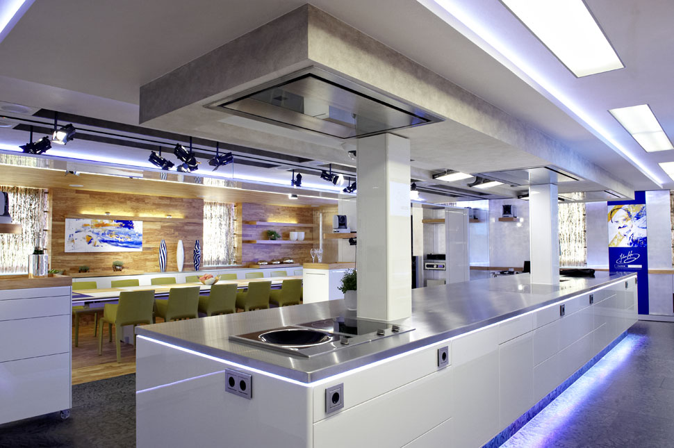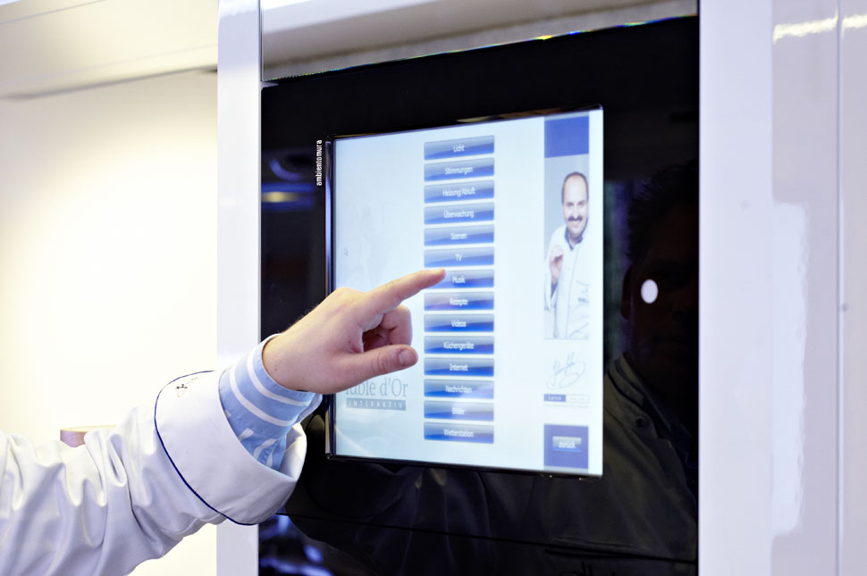 Neben der AV-Technik sticht die LED-Beleuchtung ins Auge, die in der Kochschule verbaut wurde: Im gesamten Raum sind zahllose LED-Leuchten installiert, die aber so dezent integriert sind, dass sie zunächst gar nicht auffallen. Erst wenn Johann Lafer und sein Team die diversen Lichtstimmungen vorführen, die sich damit erzeugen lassen, wird deutlich, wie viel Technik auch hier drinsteckt. Die Steuerung aller Komponenten hat die Firma Cibek realisiert und für die Bedienung etliche Touchpanels integriert, von denen aus sich die einzelnen Stimmungen und Elemente abrufen und steuern lassen. Allein bei der Beleuchtung gibt es zahlreiche Presets, um ganz unterschiedliche Lichtstimmungen zu schaffen. Aber der Chefkoch kann über die Bedienpanels auch auf eine Datenbank mit 16.000 hinterlegten Rezepten ebenso zugreifen, wie er auch spezielle Musik abrufen kann, die im Hintergrund laufen soll.