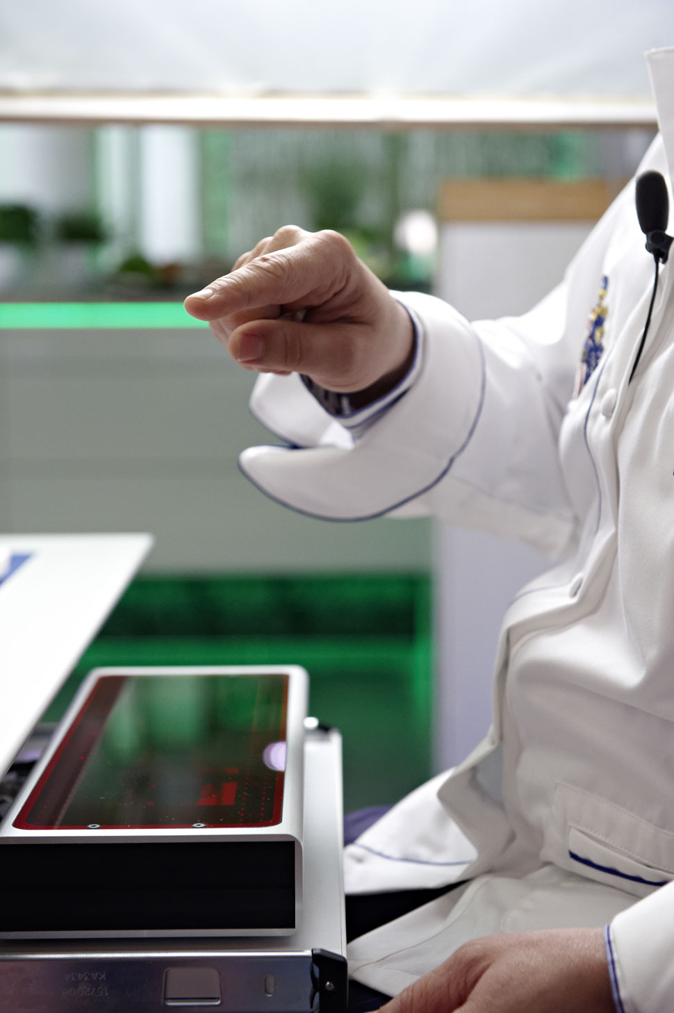 Neben der Steuerung per Touchpanel hat sich Technikfan Johann Lafer noch eine weitere Besonderheit geleistet: Die Steuerung der Einzelkomponenten mit Gesten. Dafür hat das Heinrich-Hertz-Institut Berlin gemeinsam mit dem Fraunhofer Institut für Nachrichtentechnik ein System für die berührungsfreie Bedienung der Technik entwickelt. Wie funktioniert das? Letztlich nehmen zwei Infrarot-Kameras, die in einer ausziehbaren Schublade unterhalb des Tisches untergebracht sind, die Bewegungen der Hände auf, eine Software trackt und analysiert diese Aufnahmen in Echtzeit und gibt darin enthaltene Befehle an die Steuerung weiter. Konkret kann man sich das so vorstellen: Johann Lafer sitzt am Ende der Tafel, zeigt mit den Händen auf die sieben Meter entfernte Leinwand, auf der das »Touchpanel« zu sehen ist und »tippt« mit dem Finger auf einen virtuellen Button – und wie von Geisterhand wird der gewünschte Befehl tatsächlich ausgeführt. Auch eine sprachgesteuerte Bedienung für das System ist vorgesehen, wenn auch mit den Einschränkungen, die solche Systeme derzeit noch aufweisen.