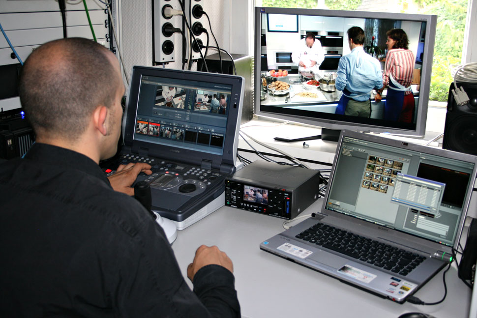 Wer sich heutzutage die Hochglanzprospekte der Küchenhersteller ansieht oder einen Rundgang durch eines der modernen Küchenparadiese unternimmt, der weiß, dass es hier ganz zweifelsohne einen Markt gibt, in dem sich Architekten, Designer und Innenarchitekten wahrlich austoben können – sofern das Thema Küche bei einer zahlungskräftigen Kundschaft weiterhin so hoch im Kurs bleibt. Auch Johann Lafer verzichtet in seiner komplett renovierten Kochschule nicht auf jene Ingredienzien, die in der aktuellen Küchenwelt angesagt sind: Olivenholz, weiße Hochglanzfronten und wertige Steine sind die dominanten Elemente der Inneneinrichtung seiner Kochschule »Table d’Or« in Rheinland-Pfalz. Doch es ist eben nicht nur die Optik der Kochschule, die ins Auge sticht, sondern auch die Ausstattung. »Johann Lafer wollte innovative AV-Technik, tolle Bilder und hervorragenden Ton in seiner Kochschule«, fasst Walter Jünkering, Geschäftsführer der Kölner Firma Ben Hur die wichtigsten Anforderungen des Sternekochs zusammen. In diesem Bestreben habe man ein vollautomatisiertes, digitales HD-Kochstudio entwickelt, das sich sehen lasse könne. Zentrale Elemente dieser Lösung sind vier fernsteuer- und schwenkbare Sony-Kameras des Typs BRC-H700, die via HD-SDI mit einer Anycast-Station HD (Test) verbunden sind. Damit realisiert Ben Hur bei jedem Kochkurs einen Live-Vorschnitt, der unterbrechungsfrei mit dem XDCAM EX-Recorder PMW-EX30 auf SxS-Karten aufgezeichnet wird. Dieses Material bearbeitet Ben Hur dann direkt mit dem Schnittsystem Vegas von Sony (Test) weiter und schneidet üblicherweise aus dem Material des Kochkurses einen Teaser-Clip, den die Teilnehmer des Kochkurse schon zum Nachtisch ansehen und am Ende des Kurses sogar auf Blu-ray Disc mitnehmen können.