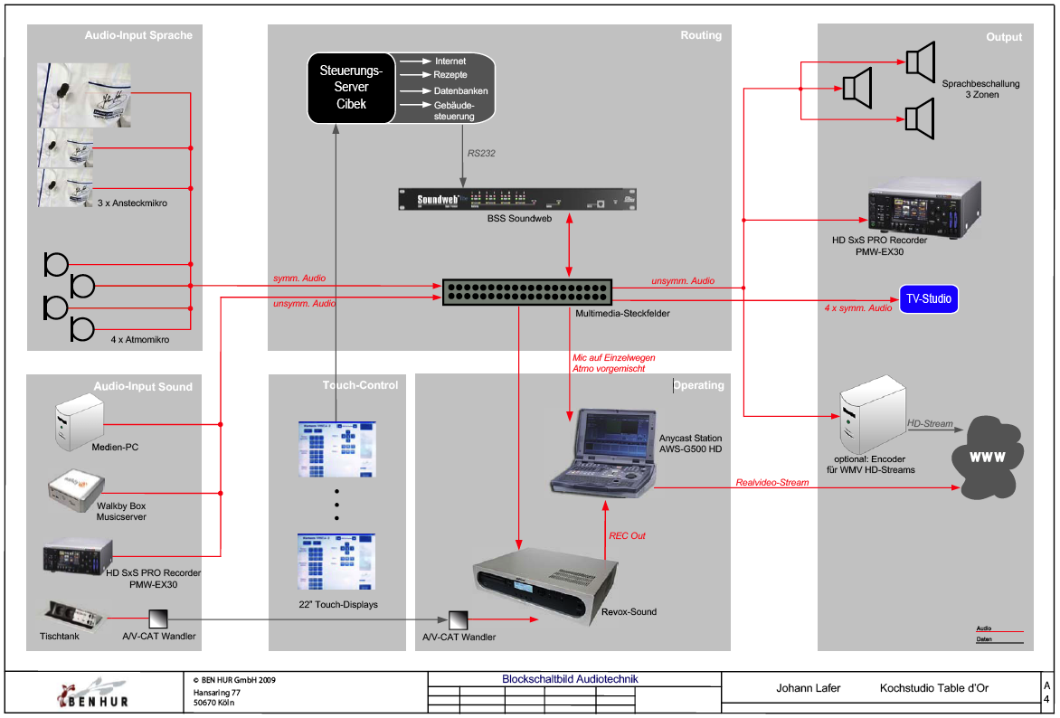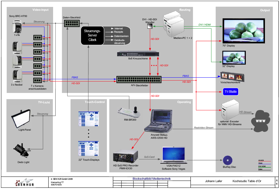 »Diese Küche ist nicht nur ein Eldorado für Gourmets und Kochbegeisterte. Sie setzt auch in Sachen Technik, Innovation und Flexibilität der Gesamtlösung neue Standards«, erklärt Walter Jünkering, Geschäftsführer bei Ben Hur. Und weiter: »Johann Lafer wollte von uns eine Lösung, die keine Kompromisse eingeht, die zuverlässig und flexibel zu nutzen ist.« Die gesamte Audio- und Videotechnik wurde von Ben Hur so geplant, dass sie jederzeit mit einer professionellen Broadcast-Umgebung verknüpft werden kann und bei aufwändigen TV-Produktionen um bemannte Kamerazüge und weitere Mikrofonwege erweiterbar ist. Auch das benachbarte TV Studio Guldental kann jederzeit mit dem »Table d´Or« verkoppelt werden.