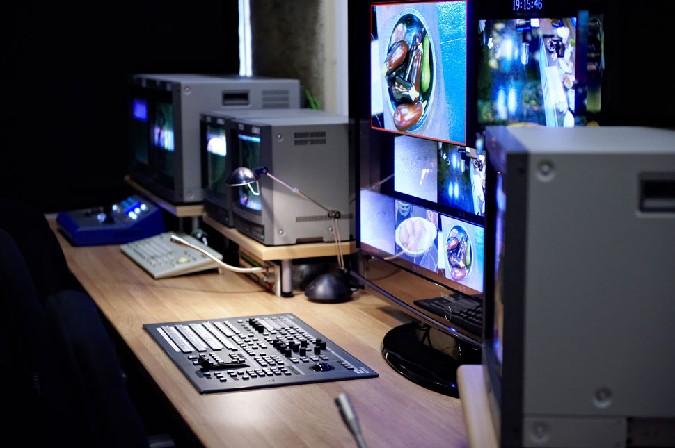 Eine weitere Besonderheit des Gesamtsystems: Johann Lafer kann jederzeit während des Kurses mit einer eigens für ihn programmierten Software Kamerapositionen speichern und wieder aufrufen. Über das gleiche Bedienpanel kann er auch audiovisuelle Elemente abrufen, die dann auf diversen Monitoren in der Kochschule angezeigt werden: Videos, Grafiken und Fotos.