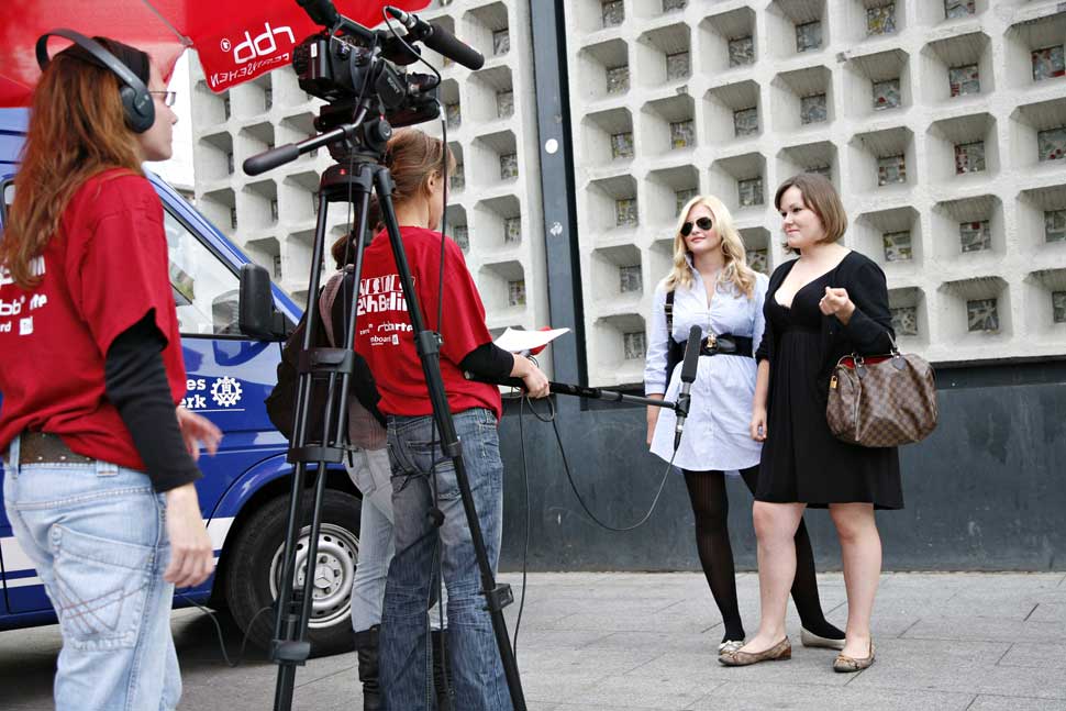 Volker Heise: Die Stadt ist nicht in einem Satz zu erzählen, sie entzieht sich der Beschreibung. Schon von ihrem Grundwesen her ist sie maximale Verschiedenheit auf engstem Raum. Darum fand ich die Idee, die Stadt nicht in Form eines Films zu erzählen, sondern in Form eines Fernsehprogramms, die adäquate Lösung. Programme erlauben Verschiedenheit, während Filme geschlossene Erzählungen sind. Programme dauern aber auch ihre Zeit. Mich hat Fernsehen auch immer mehr interessiert als Film. Aber die großen Künstler im Fernsehen sind ja die Programmmacher. Die Leute, die die ganze Fläche des Tages bespielen. Und da habe ich mich gefragt, was passiert, wenn ich, ein Dokumentarfilmer, ein Fernsehprogramm mache, was passiert, wenn ich nicht im Raster spiele, sondern mit dem Raster. Darum ist das Programm auch ein Spiel mit dem Medium Fernsehen. Wir greifen Elemente auf, die es schon gibt, drehen sie hin und her und setzen sie neu ein. Es gibt Elemente der Serie, Elemente von Nachrichten. Die Grundstruktur des Programms habe ich bei CNN geklaut: Regelmäßig Nachrichten — nur sind es bei uns keine Weltnachrichten, sondern Frau Bullack geht einkaufen, und statt Werbung gibt es bei uns die Videos der Zuschauer. Ich wollte auch der Ursprungsidee treu bleiben: Die Vielschichtigkeit erzählen, die Milieus und Interessengruppen. Es sollte nur keine dröge Vorlesung werden, darum haben wir uns früh entschlossen, die Stadt über Menschen zu erzählen. Wir folgen ihnen den ganzen Tag, vom Aufstehen bis sie ins Bett gehen, und wir verzahnen ihre Geschichten miteinander. Sie kommentieren sich gegenseitig, sie reiben sich aneinander, widersprechen sich oder harmonieren; sie erzeugen Echos und gemeinsam einen neuen Klang. Das geht nur im Medium Fernsehen, wo man einen ganzen Tag lang senden kann, und das geht nur, wenn man sich auch an die Gesetze des Fernsehens hält.