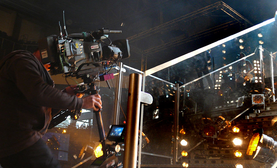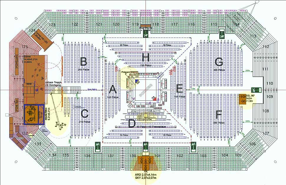 In der 11.000 Zuschauer fassenden Halle hatte MMG für die Übertragung des Box-Events insgesamt 15 Kameras platziert. Zwei LDK 8000 von Grass Valley beobachteten durch ein 27- und ein 101fach-Zoom von Fujinon das Geschehen im Boxring von einem Podest hoch oben in den Zuschauerrängen aus, das auf der Querachse des Stadions platziert war. Auf einem zweiten, tiefer positionierten Podest an der Stirnseite der Halle war eine Slomo-Kamera des Typs LDK 8300 mit Fujinon-Telezoom nahe der Längsachse platziert. Ihre Aufgabe war es, neben den Aktionen im Boxring auch Bilder vom Einmarsch der Boxer zu liefern, die über eine Showtreppe in die Arena kamen. Eine weitere LDK 8000 war am Remote-Kopf eines von PMT angemieteten Krans aufgehängt, der vor der Bühne und neben der Showtreppe Position bezogen hatte. Ein weiterer Remote-Head mit Kamera war über dem Boxring platziert.