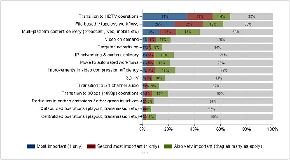 Um die wichtigsten Technologie-Trends in Deutschland zu ermitteln, sollten die Befragten aus einer Liste von 14 Trends auswählen, welche am »wichtigsten« und am »zweitwichtigsten« sind, außerdem welche »sehr wichtig« für ihr jeweiliges Geschäftsfeld sind. Die Antworten wurden in der Auswertung gewichtet, um so einen Trend-Index erstellen zu können: Die »wichtigsten« Trends wurden mit 5 multipliziert, die »zweitwichtigsten« mit 3 und die »sehr wichtigen« mit 1. So ergab sich ein vergleichsweise eindeutiges Ergebnis: Auf Platz 1 liegt der »Übergang zu HDTV«, auf Platz 2 »File-basierte, bandlose Workflows« und auf Platz 3 »Multiplattform Content-Delivery«.