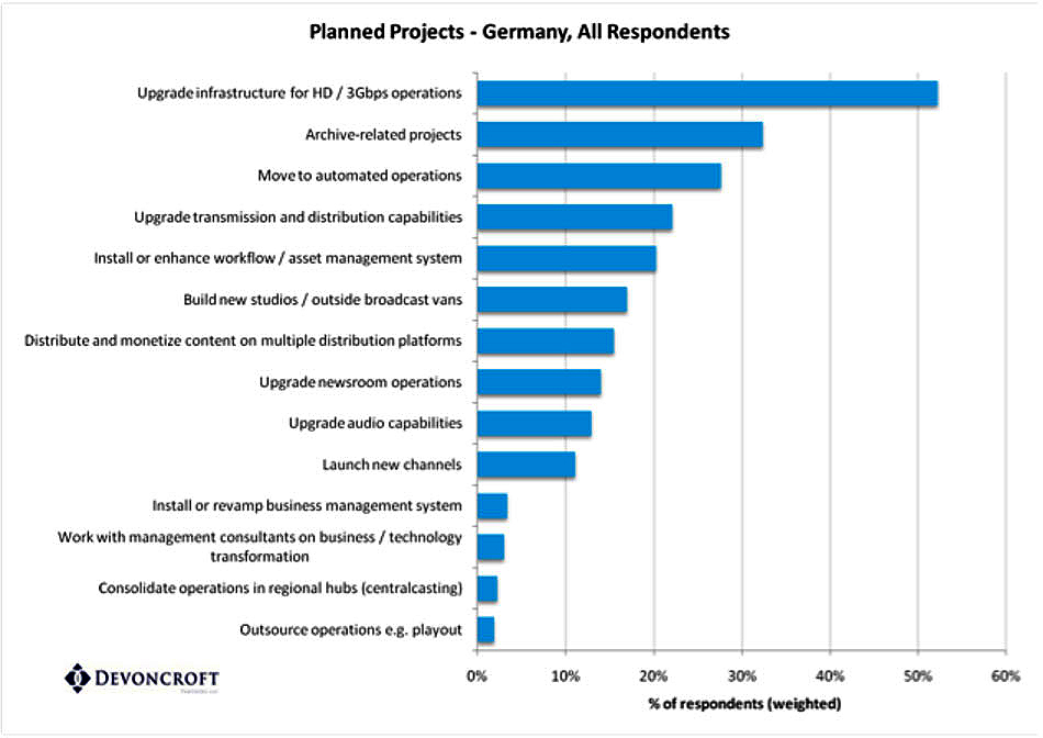 Den Befragten wurde eine Liste von Projekten vorgestellt, aus denen sie bis zu fünf auswählen konnten, die sie fürs aktuelle Jahr geplant haben. Mit großem Abstand wählten die Befragten »Verbesserung der Infrastruktur für HD / 3 Gbps« als wichtigstes Projekt. Das bestätigt den oben genannten »Übergang zu HD« als wichtigsten Technologie-Trend, denn um diesen umzusetzen, muss sowohl in die Infrastruktur wie auch in die Übertragungs- und Distributions-Kapazitäten investiert werden.