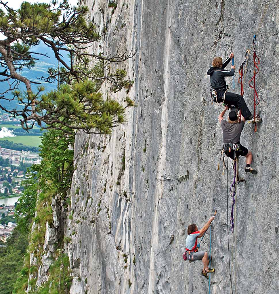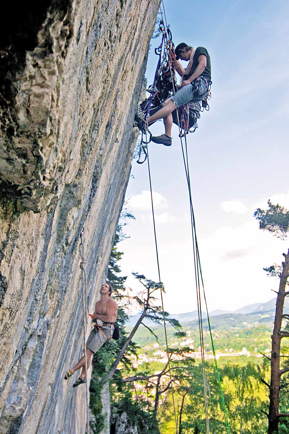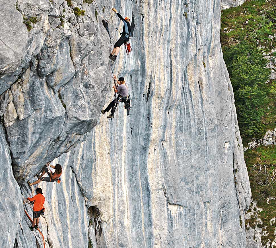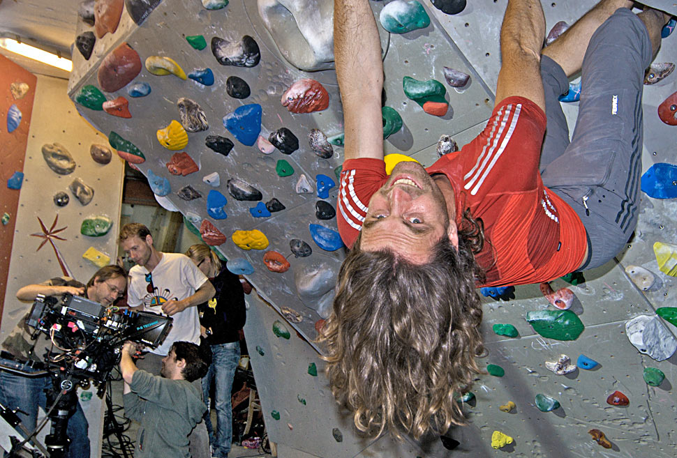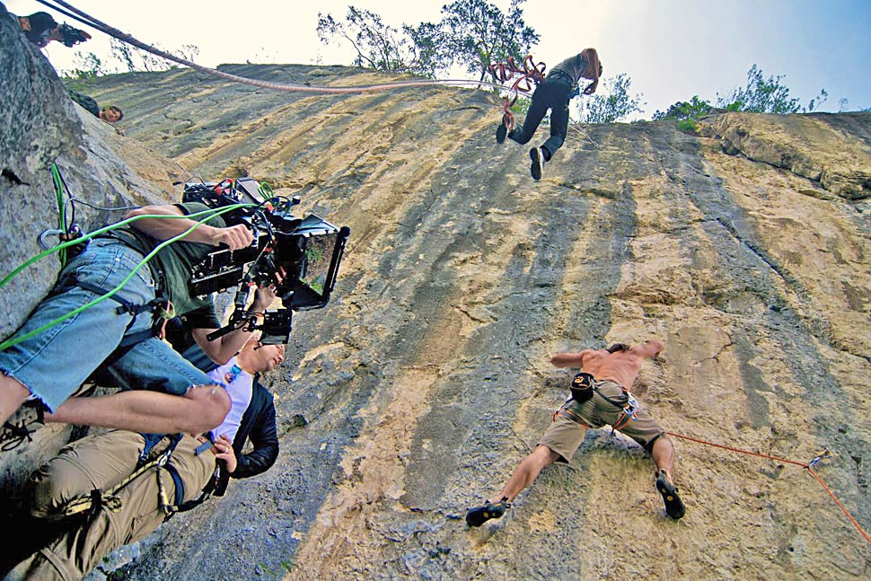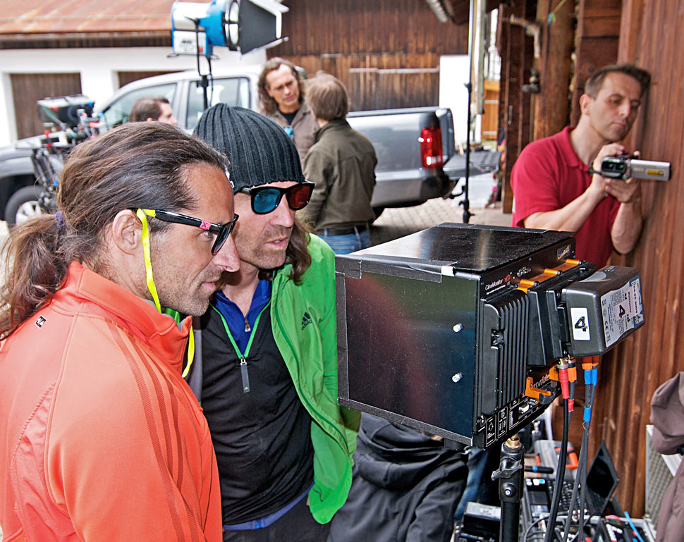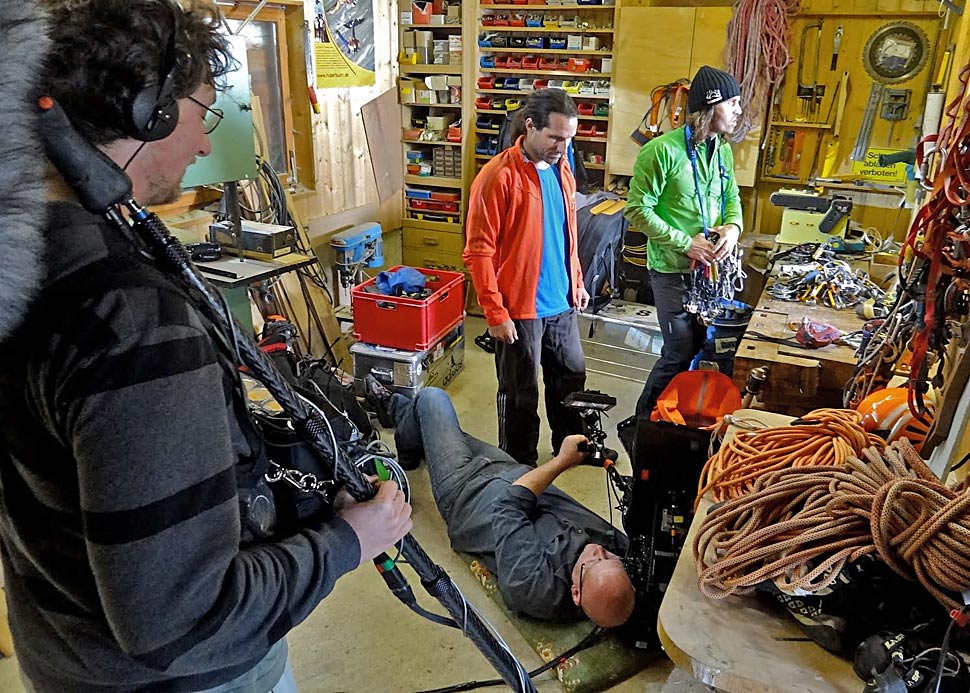 Mehr und mehr entwickelten wir ein Gefühl für Tiefenbudgets, negative und positive Parallaxen, Scheinfensterverletzungen und all die anderen Geheimnisse, die 3D zu bieten hat. Der Zeitplan war eng. Wir hatten eine Fülle an Motiven zu bespielen, die mit zeitaufwendigen Ortswechseln verbunden waren. Naturgemäß ließen sich die einzelnen Drehorte auch nicht immer direkt anfahren, was zur Folge hatte, dass wir mehr als einmal, bepackt wie die Mulis, steile Berge hinaufkeuchten, während einheimische Hilfskräfte leichtfüßig an uns vorbeizogen. So fanden wir uns des Öfteren gefährlich dicht am Rand steil abfallender Felskanten wieder, die uns einen atemberaubenden Blick auf die verschiedenen Kletterrouten der Hubers ermöglichten. Eine wirklich intensive Therapie gegen Höhenangst!