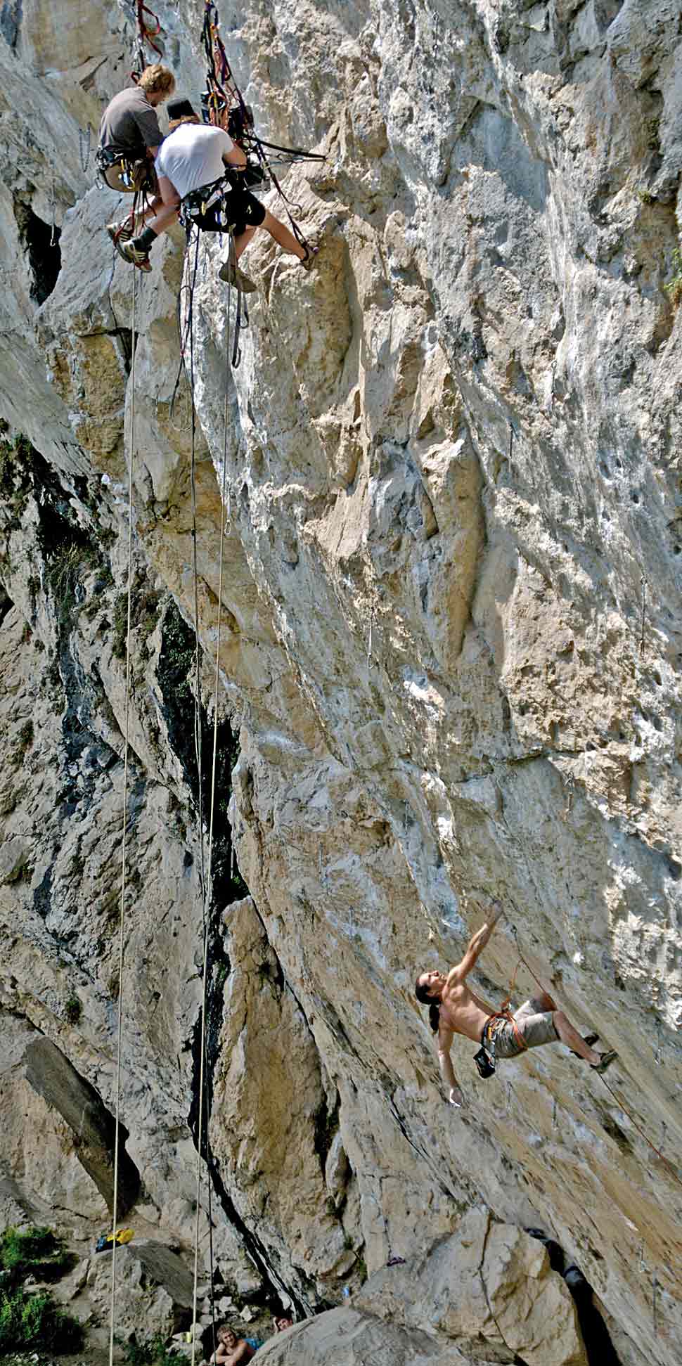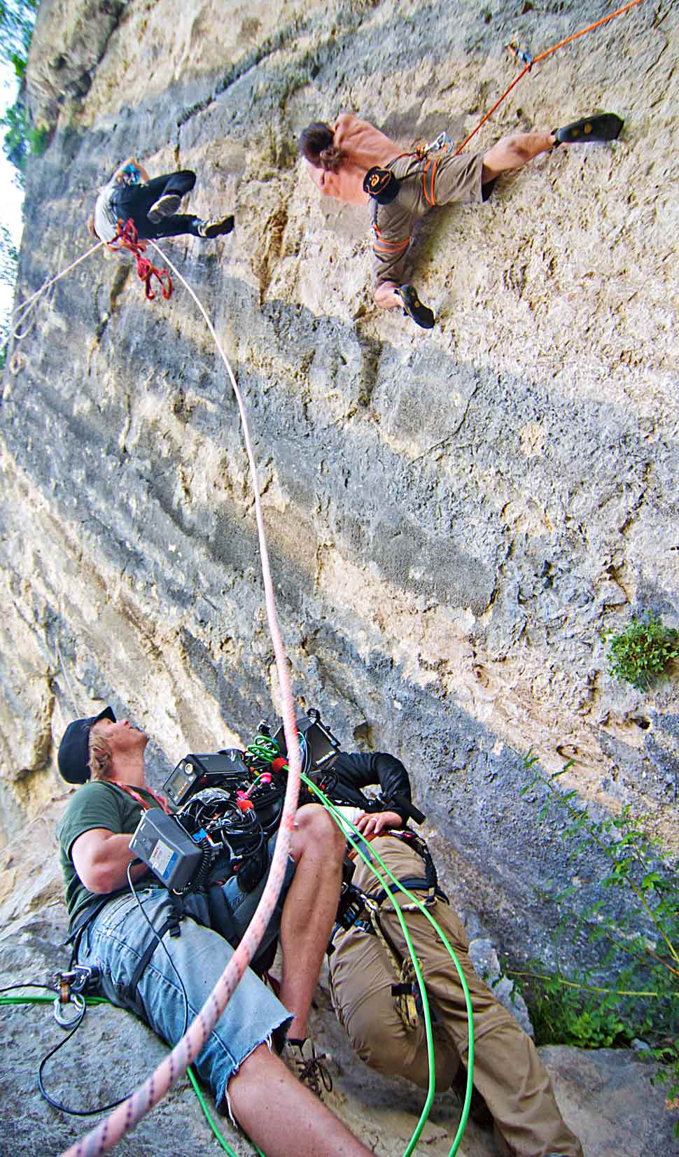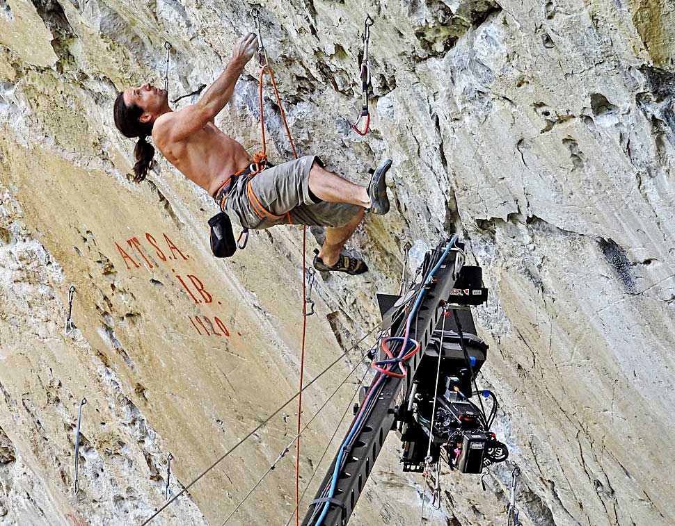 Mit solchen Problemen hatten unsere Extremkameramänner nicht zu kämpfen. Geradezu akrobatisch bewegten sie sich an ihren Seilen, die mir angesichts der Höhe eher wie Spinnweben vorkamen, in den Wänden und lieferten uns beeindruckende Bilder der Huberbrüder während ihrer Vorbereitungen auf ihr großes Projekt, die Route »Karma«. Während sie in schwindelerregender Höhe agierten, führten wir vom Boden aus per drahtloser Fernsteuerung die 3D-Einstellungen des Rigs nach. So behielten wir jederzeit die Kontrolle über den optimalen 3D-Eindruck unserer Bilder.