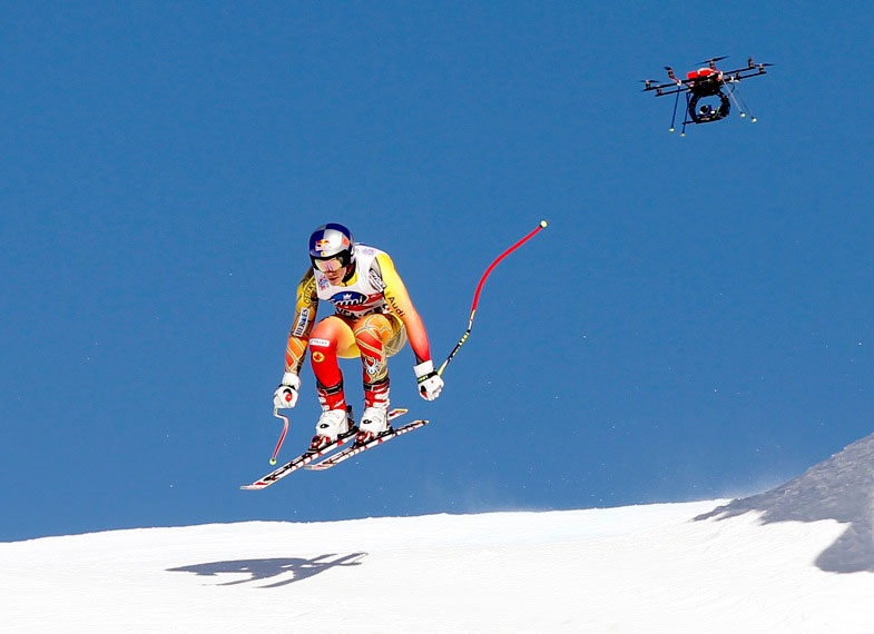 Bei diesen Skiabfahrtsrennen wurde der Oktokopter genutzt, um etwa jeden fünften Skirennläufer seitlich oder von hinten zu verfolgen und für die Übertragung zusätzliche spektakuläre Bilder aus der Luft zu liefern.