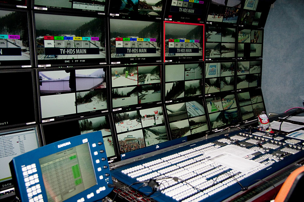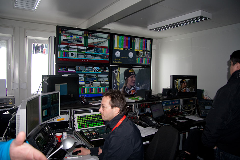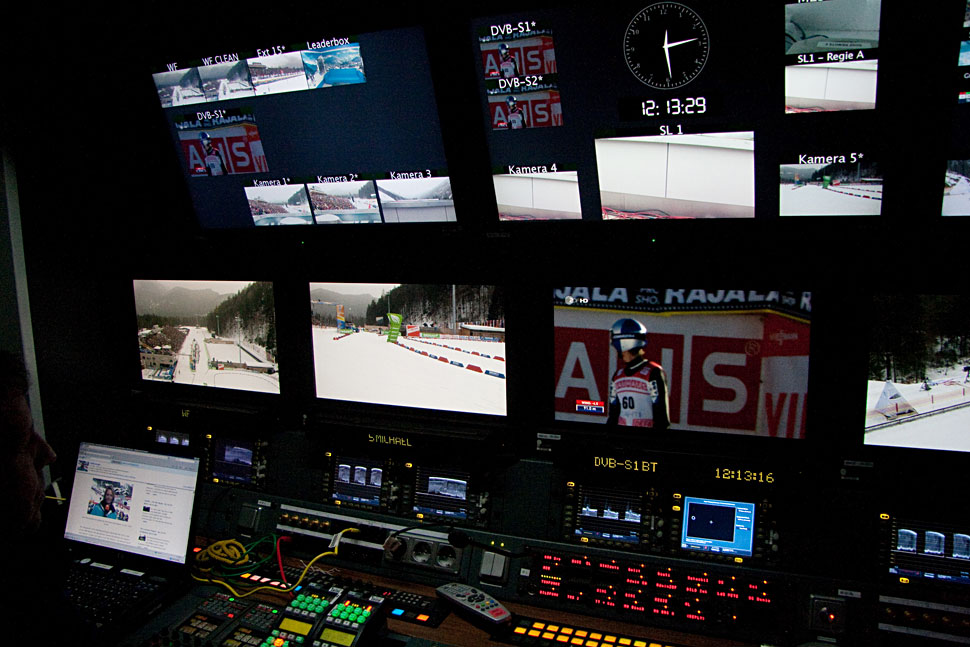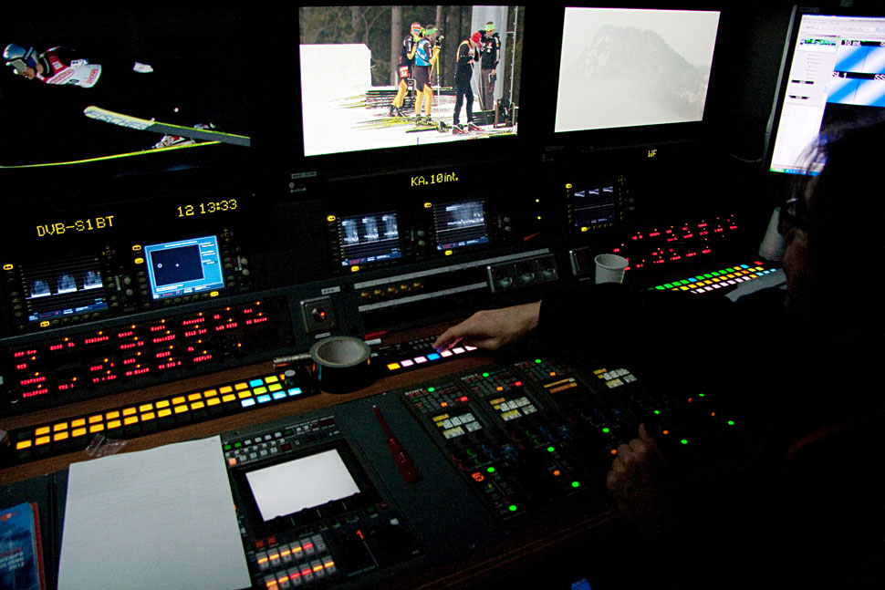 Mit 39 Kameras, wie sie bei der WM in Ruhpolding eingesetzt wurden, ist das eine komplexe Aufgabe, die einiges an Vorbereitung, aber vor allem auch Routine und die Zusammenarbeit mit den »Spottern« erfordert – jenen Leuten im Team, die entlang der Strecke wichtige Infos an die Kameraleute und in die Regie weitergeben: etwa, wenn an einem bestimmten Punkt der Strecke gerade die beste Zwischenzeit abgeräumt wird, wenn ein Läufer entlang des Kurses stürzt oder ein Favorit einen anderen überholt.