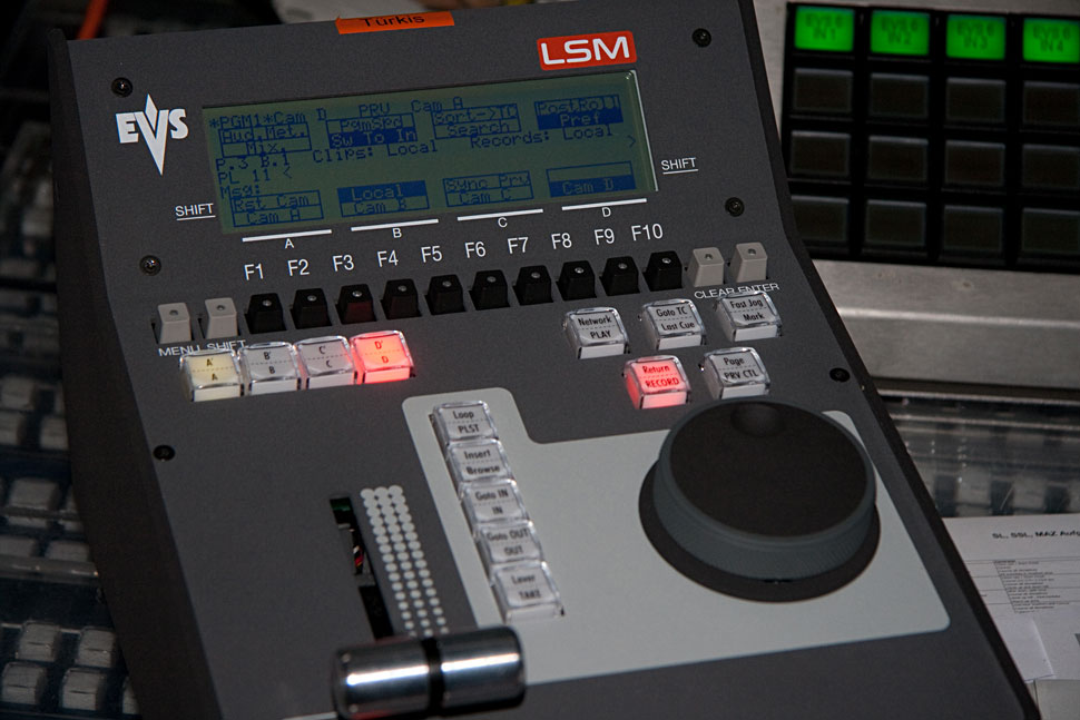 Die EVS-Server verteilen sich auf zwölf internationale EVS-XT3-Server, eine Highspeed-EVS, eine zentrale EVS im MCR und auf vier nationale EVS-Maschinen im BR-Ü-Wagen. Operator Patric Jung erklärt dazu: »Im Gegensatz zur Alpinberichterstattung benötigt man beim Biathlon einfach mehr Slomo-Server, denn man kann nicht so sequenziell arbeiten wie bei einem Abfahrtsrennen. Gerade bei den Einzelstarts gibt es jede Menge Parallelaktivität, die man ohne EVS-Server gar nicht zeigen könnte, denn letztlich müssen wir jede Kamera jederzeit aufzeichnen.«