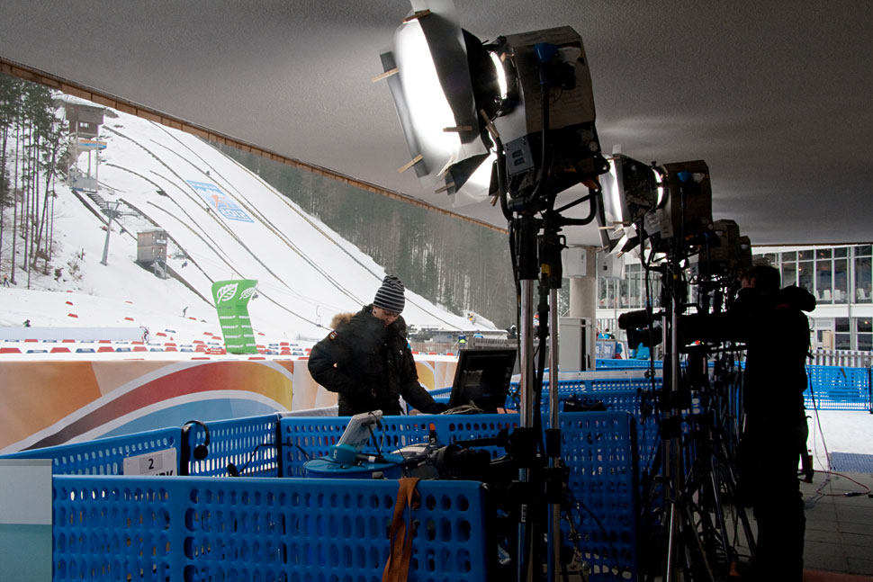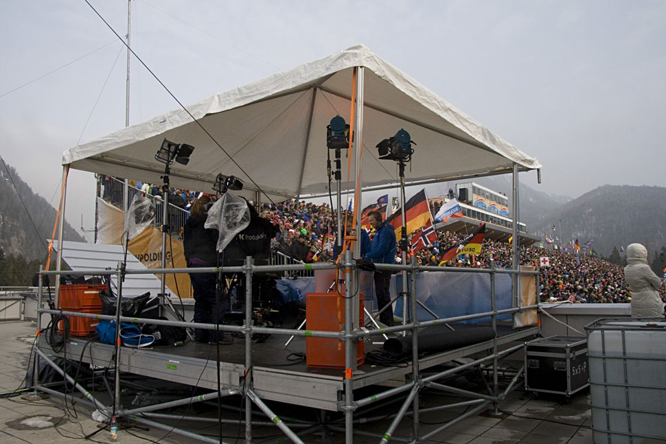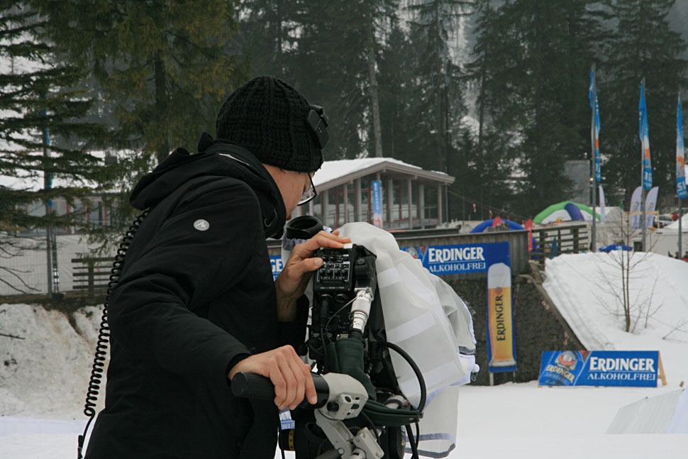 Eine Goalcam von TV Skyline lieferte Beauty Shots, und drei Kräne, ein Scissor-Lift und eine MAT-Towercam ergänzten den Kamerapool. Mit vier Drahtloskameras wurde das internationale Bild ergänzt, zwei waren zusätzlich noch fürs nationale Bild im Einsatz. Die nationalen Drahtlos-Kameras sorgen insbesondere in der Vorberichterstattung für Bilder aus den Außenbereichen wie etwa Waffenkontrolle oder Aufwärm- und Wachsbereich. »Die Kollegen mit den sechs Drahtloskameras deckten in Ruhpolding ein Riesenareal ab, das sind locker 300 x 300 m«, so Florian Rathgeber vom ZDF.