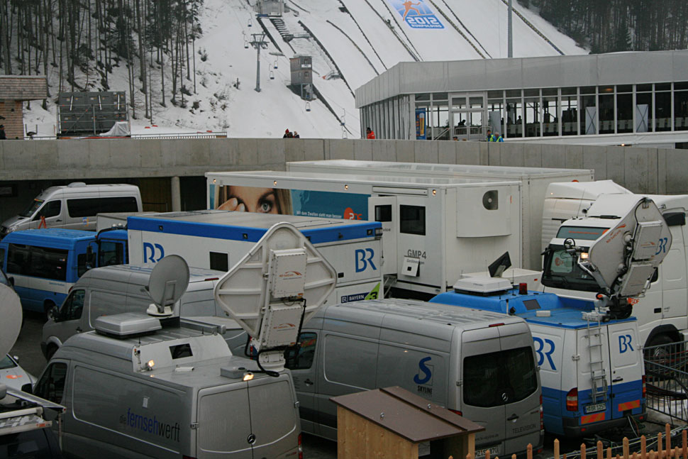 Zusätzlich zum FÜ1 war im Rahmen einer Produktionsbeihilfe auch ein SWR-Ü-Wagen im Einsatz, der direkt in Ruhpolding vom Kurhaus und der Champions-Plaza übertrug und für das Bayerische Fernsehen produzierte. »Da gab es jede Menge an Schalten und Live-Sendungen, unter anderem für die Abendschau im BR«, erläutert Jürgen Kreissl.