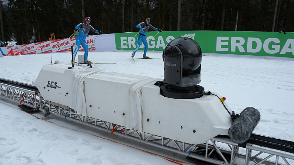 Eine weitere Railcam setzte das ZDF im Stadion am Stadioneinlauf ein. Sie war mit einer Ikegami-Kamera ausgerüstet und zog ein Glasfaserkabel hinterher. Die dritte und technisch betrachtet interessanteste Schienenkamera erklomm auf einer Länge von rund 300 m den Schießplatzberg, konnte so die Athleten während des Anstiegs begleiten und sich an deren Geschwindigkeit anpassen. Die Besonderheit des Systems von SCS beteht darin, dass es auch Steigungen und unebene Stecken zurücklegen kann. »Das System fährt auf ganz normalen 4-Punkt-Traversen, die SCS speziell für die jeweilige Strecke biegt und anpasst«, erläutert Georg Eisengräber. Das System ist kreiselstabilisiert, und die Sony-Cineflex-Kamera wurde kabellos fernbedient. Beheizbare Schienen sorgten zudem dafür, dass die Schienenkamera nicht mit Wetterproblemen zu kämpfen hatte.