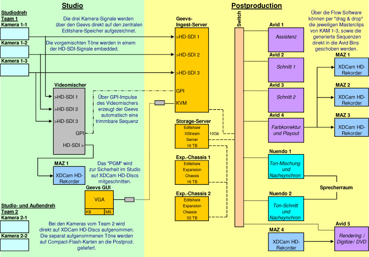 Jens-Peter Ramm, technischer Projektleiter bei der Studio Hamburg Postproduction: »Bei der HD-Umstellung war nicht nur die Verbesserung der Bildqualität das alleinige Ziel, auch die knapp bemessene Nachbearbeitungszeit jeder einzelnen Folge spielte bei unseren Überlegungen eine große Rolle. Beim früheren SD-Workflow wurde das auf Digital-Betacam-Kassetten angelieferte Kameramaterial über eines der Avid-Systeme auf unser damaliges Editshare-Storage digitalisiert. Bei den Studioaufnahmen wurde aus zeitlichen Gründen meistens nur die Programmfassung des Videomischers verwendet. In seltenen Fällen wurde zusätzlich noch eine abgesteckte Kamera eingespielt.«
