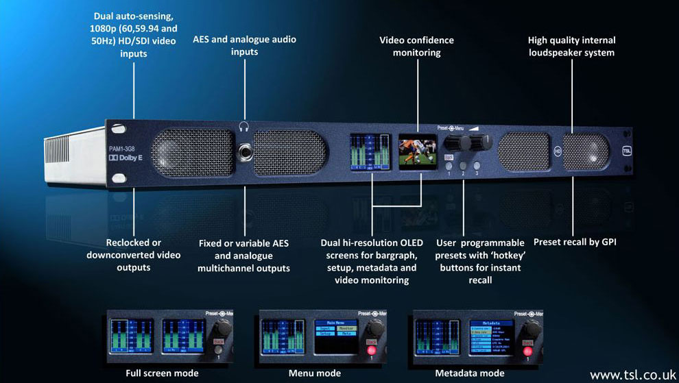 PAM1 ermöglicht es, acht Audiokanäle zeitgleich zu überwachen, Dolby D/E zu dekodieren und Metadaten anzuzeigen. Lautheit kann gemäß EBU-Richtlinie R128 (gültig seit Januar 2012) überwacht und ein Audio-Delay bis 250 ms eingestellt werden.