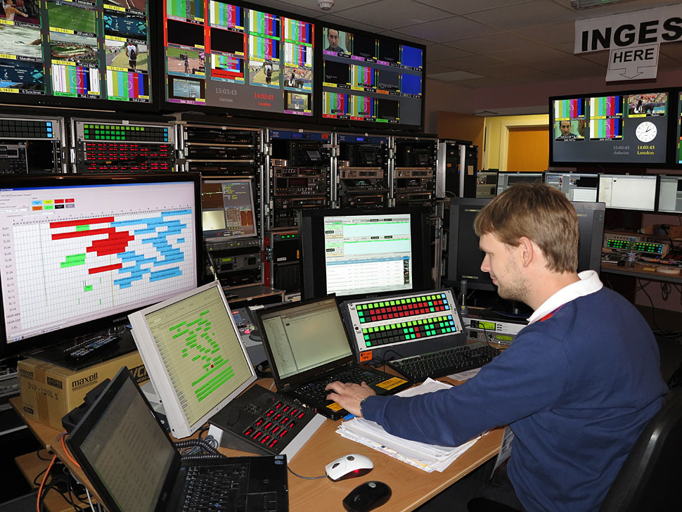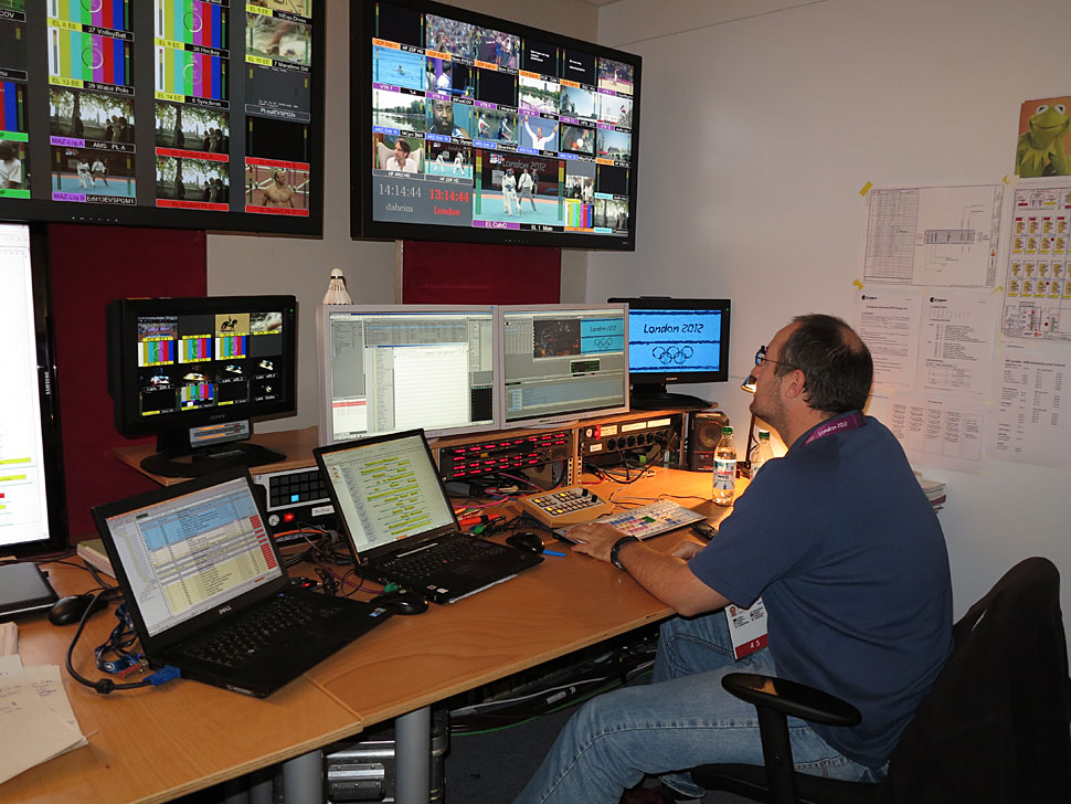 ARD und ZDF produzieren die großen Sport-Events wie Olympia oder Fußball-Welt- und Europameisterschaften seit Jahren mit hohem technischen Aufwand. Bei der Fußball-Europameisterschaft in Polen und der Ukraine wie auch bei den Olympischen Spielen in London setzten die beiden Sender auf ein bandloses und vernetztes Produktionssystem, das nun schon bei einigen Großevents im Einsatz war und über die Jahre ständig weiterentwickelt und verfeinert wurde. Den Kern des Systems bildet eine vernetzte Umgebung aus Avid-, EVS- und Fairlight-Systemen. Intern wird bei dem Produktionsystem durchgänging und ausschließlich im DNxHD-120-Codec in 1080i50 gearbeitet. film-tv-video.de hat sich das System bei der TV-Produktion der Olympischen Spiele in London angesehen.
