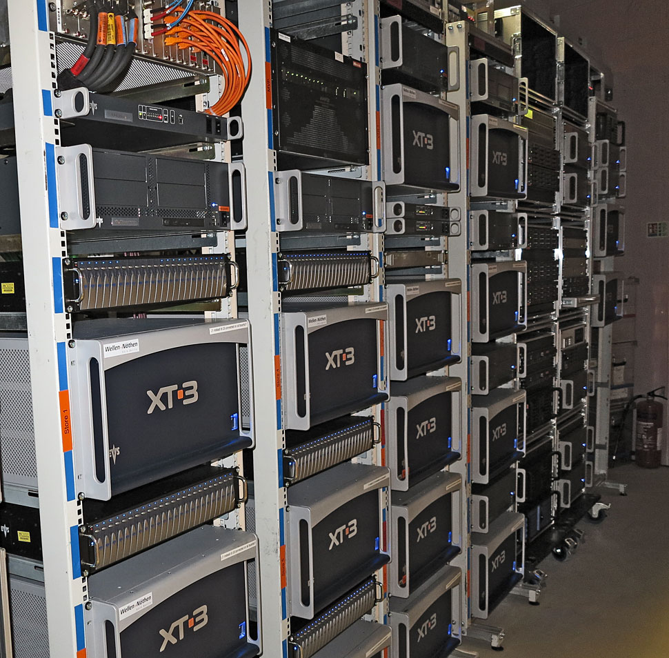 Insgesamt setzten ARD und ZDF 17 sechs-kanalige EVS-XT3-Server ein und kamen so auf eine EVS-Speicherkapazität von rund 3.000 Stunden – 1.000 h davon als Nearline-Speicher auf PC-Basis. Sechs XT3-Server waren als Haupt-Speicher vorgesehen, die unter anderem im Havariefall des Isis bis zu zehn Avid-Schnittplätze mit den letzten 90h Material über eine RS-422-Anbindung hätten versorgen können. Fünf weitere XT-3 Server wurden fürs Editing von Zusammenfassungen einzelner Sportarten genutzt, zusätzliche EVS-Server gab es in der Regie (Highlight-, Loop- und Playout-EVS) und im Sofo. Ein weiterer EVS-Server transferierte Material per IP-Browse und IP-Director vom EVS-Netzwerk des Host-Broadcasters, das in AVC-Intra 100 vorlag, per Echtzeit-Videoausspielung in die Avid/EVS-Welt. Das klingt wie ein Umweg, war aber dem Umstand geschuldet, dass zum einen das Host-Netz vom ARD/ZDF-Produktionsnetz getrennt werden sollte und zum anderern innerhalb des Produktionssystems nur mit einem Codec, nämlich in DNxHD, gearbeitet werden sollte.