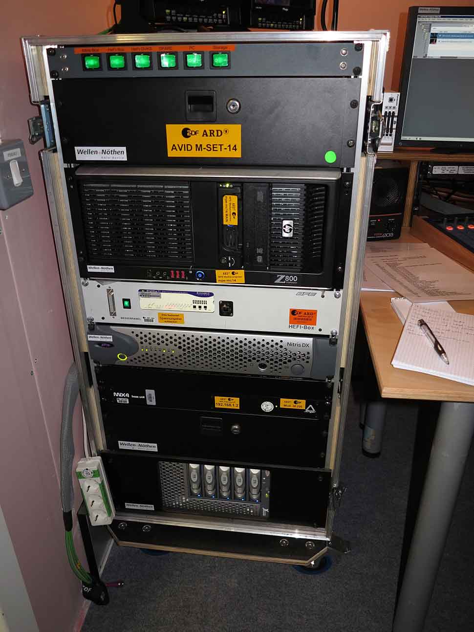 In den Schnitträumen waren die Avid-Systeme mit zusätzlicher Hardware in kompakten Flightcases untergebracht. Neben lokalem Speicher war unter anderem ein Jünger Mix4-Pult eingebaut – gedacht für die Vertonung von hochaktuellen Beiträgen. Mit TM3-Systemen von RTW realisierten die Sender direkt am Schnittplatz auch die Lautheitskontrolle der Beiträge – das ist für die Sender seit der Einführung der EBU-R128-Richtlinie neu.