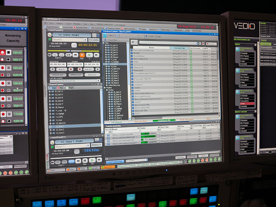 Im Zusammenspiel mit den EVS-Servern waren 14 IP-Director-Systeme im Einsatz. IP Director ist — vereinfacht gesagt — eine zentrale Datenbank-Software, mit der sich sämtliche Daten aller im Netzwerk befindlichen EVS-Server verwalten lassen. Die Software ermöglicht mit unterschiedlichen Modulen wie dem Ingest-Scheduler, mit dem Streams der XT-3 Server per XT-Access auf den Nearline-Speicher aufgezeichnet wurden, auch die Sichtung des Materials, wie auch den Austausch und Transfer von Clips zu anderen EVS-Servern oder dem Isis-System. Teil der verwendeten Software im Gesamtsetup war auch Xedio Dispatcher: Die Software-Anwendung dient dem Sichten und der Vorauswahl von Clips, die mit dateibasierten Camcorder-Systemen wie P2 und Professional Disc aufgenommen wurden.