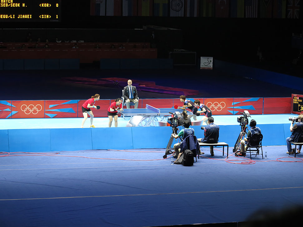 Bei den Schwimmwettkämpfen hatten ARD und ZDF zwei zusätzliche Kameras auf einer Presenter-Position platziert. »Diese Plattform, die wir dafür nutzten, war relativ klein«, berichtet Gunnar Darge, »und es war auch die einzige Presenter-Plattform, die wir im Rahmen der Olympia-Berichterstattung einsetzten.« Zusätzlich gab es im Schwimmstadion noch eine Kamera in der Mixed Zone, eine eigene Führungskamera und eine Head-On-Kamera, die hauptsächlich aufs Schwimmbecken blickte. Die Kameras stammten aus dem Pool von NDR (Grass Valley-Kameras) und ZDF (Ikegami-Kameras).
