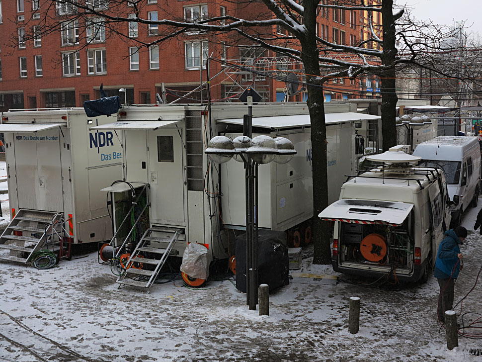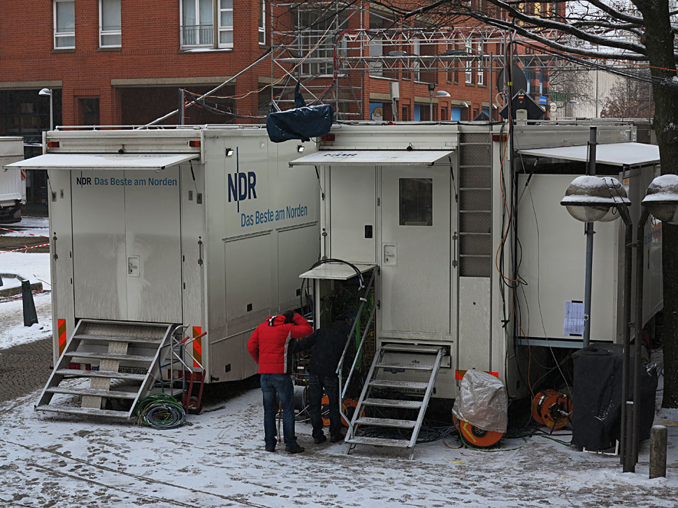 Weitere Elemente der Berichterstattung waren die Beiträge von den Wahlpartys der einzelnen Parteien. Hierfür waren zehn SNG-Teams in der Landeshauptstadt unterwegs. »Die externen Teams lieferten SD-Material an«, berichtet Ole Clausen. Das Material der SNG-Fahrzeuge wurde per Telekom-Downlink beim HD-Fahrzeug des NDR eingespeist und dann fürs HD-Fahrzeug hochkonvertiert –  oder aber in SD ans SD-Fahrzeug weitergereicht. Teile der NDR-SNG-Fahrzeuge sind zwar schon auf HD ausgelegt, doch auch sie produzierten in SD. Ole Clausen erläutert: »Der Ü3 ist immer noch auf SD ausgelegt und wird auch noch bis zum Jahr 2016 im Betrieb sein. Solange werden wir weiter im Mischbetrieb fahren müssen.«