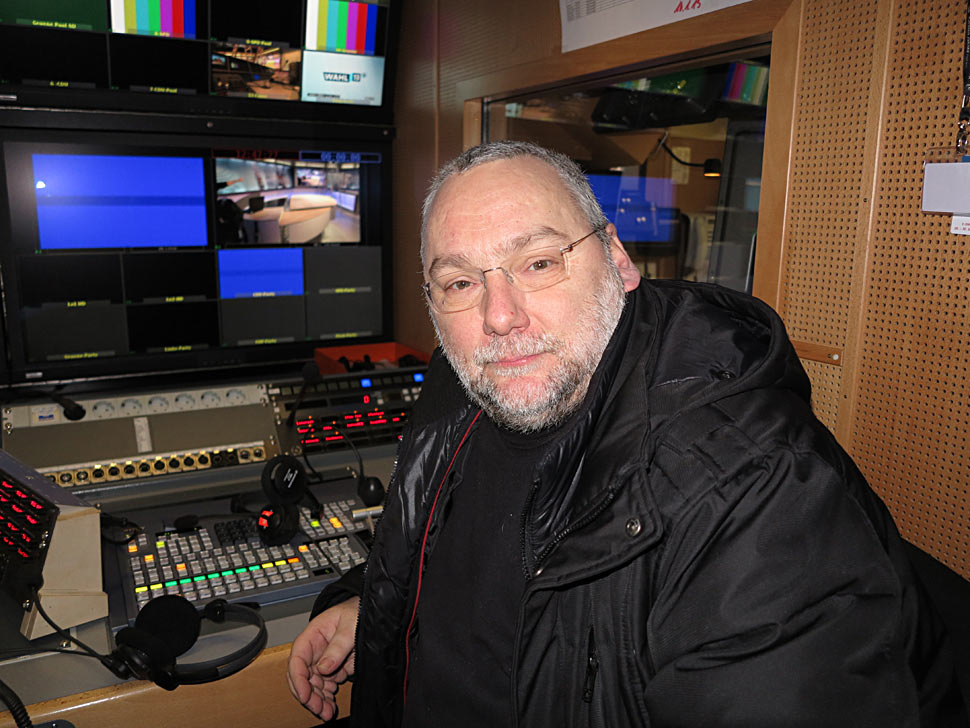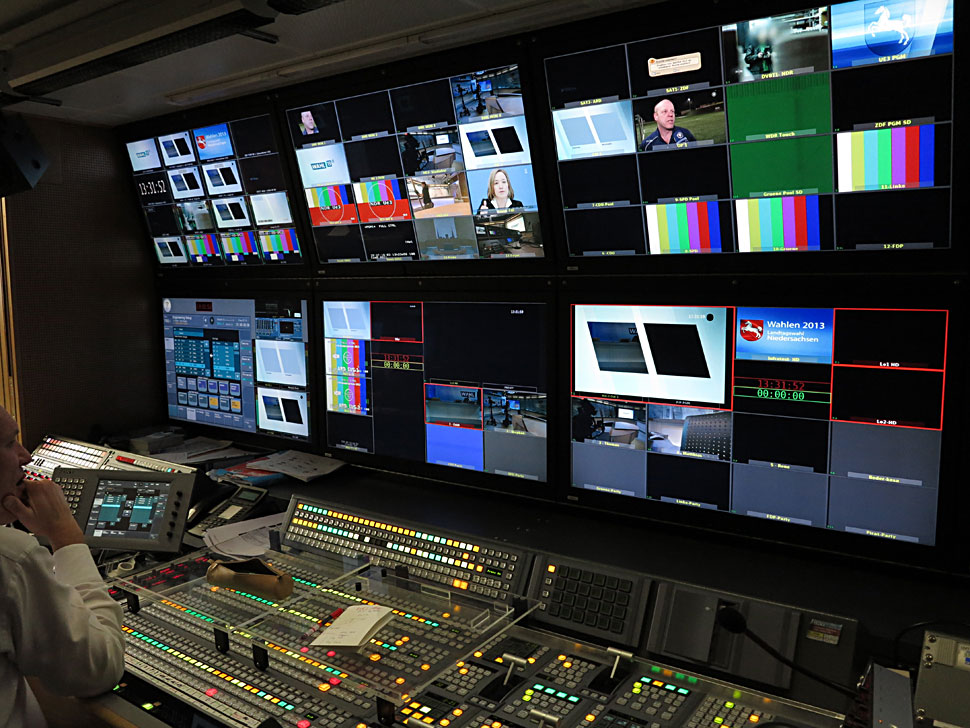 Ü-Wagen-Leiter Ulrich Flug urteilt, dass es vor allem die parallele SD/HD-Produktion ist, die eine Produktion wie die der Landtagswahl in Hannover sehr komplex macht: »Bei einer Wahl haben Sie von Haus aus schon sehr viele externe Signale, die Sie zusätzlich zum Standardumfang berücksichtigen müssen – beispielsweise von den Bundespolitikern aus der Hauptstadt Berlin. Zusätzlich haben wir aber noch die Herausforderungen, dass bei uns ein Fahrzeug in HD und das andere in SD produziert. Und das heißt ganz einfach, dass wir alle Signale doppelt vorhalten müssen – was nicht nur von der Verkabelung her, sondern auch vom Vorhalten von Wandlern, Up- und Downkonvertern und vielem weiterem, einfach das Doppelte dessen bedeutet, was wir verarbeiten müssten, wenn ausschließlich in SD oder HD produziert würde«.