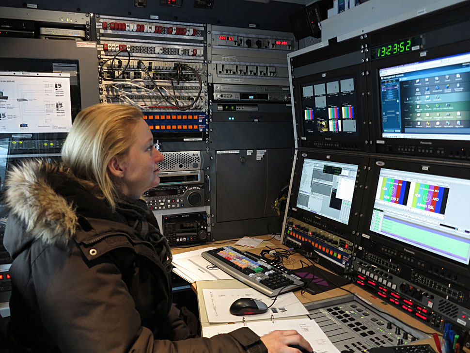 Auf dem Isis-System hatten die Cutter Zugriff auf das EB-Material, aber auch auf Sendemitschnitte sowie auf fertige Beiträge anderer Schnittmobile. »Damit konnten wir natürlich sehr aktuell arbeiten«, erläutert Kristina Kirk. Zusätzlich konnten sich die Cutter über ein EVS-Avid-Tool via IP auch auf den EVS-Servern einloggen und Material davon »herüberziehen« Weiter gab es sogar die Option, per EVS-Controller das gewünschte Material per Capturing zu holen, da jedes Schnittmobil videoseitig an die EVS-Server im Ü-Wagen angebunden war. »Damit hatten wir gleichzeitig auch ein Havariekonzept«, so Kristina Kirk, da es eine Video- wie auch eine IT-Anbindung gab. In der anderen Richtung funktionierte der Transfer ebenfalls, denn auf jedem Schnittmobil war auch ein EVS Playback-Server installiert, über den sich die fertigen Beiträge jeweils wieder zum Ü-Wagen auf die Sendeserver (XT-2/XT-3) posten ließen.