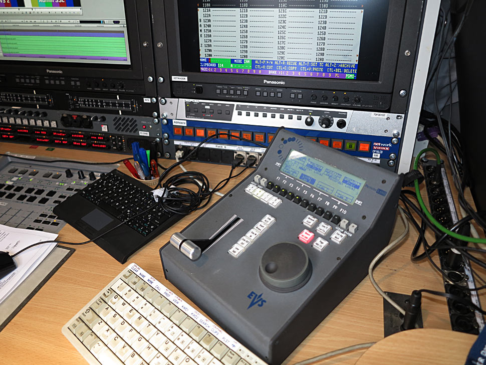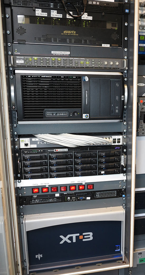 In den Ü-Wagen waren EVS-Produktionsserver im Einsatz: zwei XT3-Server im HD-Fahrzeug Ü1, zwei XT-2 im SD-Fahrzeug Ü3 und einen XT3-Server im Super-Slomo-Fahrzeug. Der Austausch von Clips und Livefeeds innerhalb dieses EVS-Netzwerkes war in alle Richtungen möglich. Weiter waren fünf Schnittmobile vor Ort, die alle für den Einmannbetrieb mit Media Composer ausgestattet sind. Sie waren ebenfalls vernetzt und sternförmig an das Slomo-Mobil angebunden, das letztlich als Admin-Mobil fungierte und mit einem Isis-5000-Speicher von Avid ausgerüstet war.