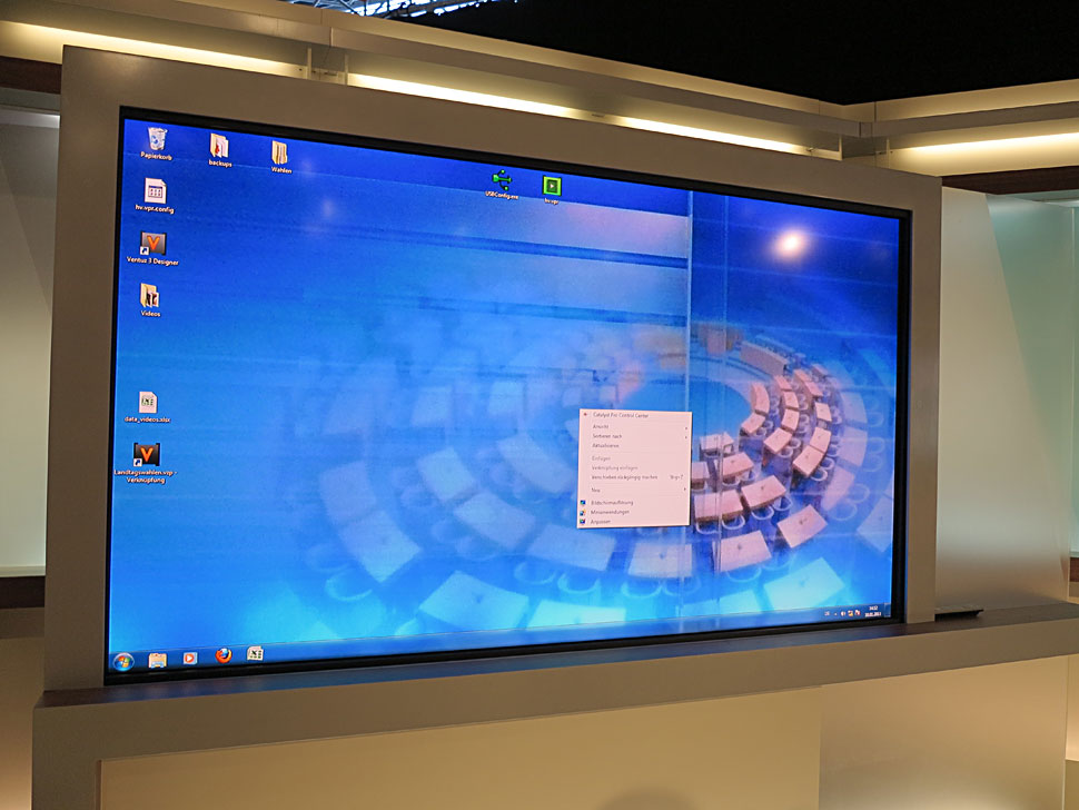 Ein wichtiges Element im Studio war ein 86-Zoll-Touchpanel von Panasonic, das in einem Rahmen der Lang AG untergebracht war. Auf diesem Panel waren die Infratest-Dimap-Grafiken mit den jeweils aktuellen Ergebnissen zu sehen.