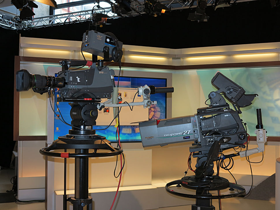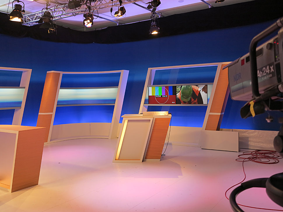 In direkter Nachbarschaft zum ARD-Studio befand sich das NDR-Regionalstudio. Hier waren ausschließlich vier SD-Kameras auf Quattro-Pumpstativen aus dem NDR-Bestand im Einsatz. »In diesem Studio hatten wir etwas mehr Platz, sodass wir auch unsere 24fach-Optiken verwenden konnten«, erläutert Ole Clausen. Im NDR-Set waren auch neue, besonders farbstabile LCD-Monitore installiert. Das spielte deshalb eine wichtige Rolle, weil sich der Farbverlauf der Studiodeko auf den Monitoren fortsetzt: »Wenn diese Monitore nicht farbstabil sind, sieht das grauenhaft aus«, so Clausen. Auf den Monitoren, die von den Ü-Wagen aus schaltbar waren, konnten auch die Schalten zu den Außenstellen dargestellt werden. Und natürlich saßen auch im NDR-Studio Infratest-Dimap-Mitarbeiter, die für den NDR die aktuellen Zahlen im NDR-Layout zulieferten.