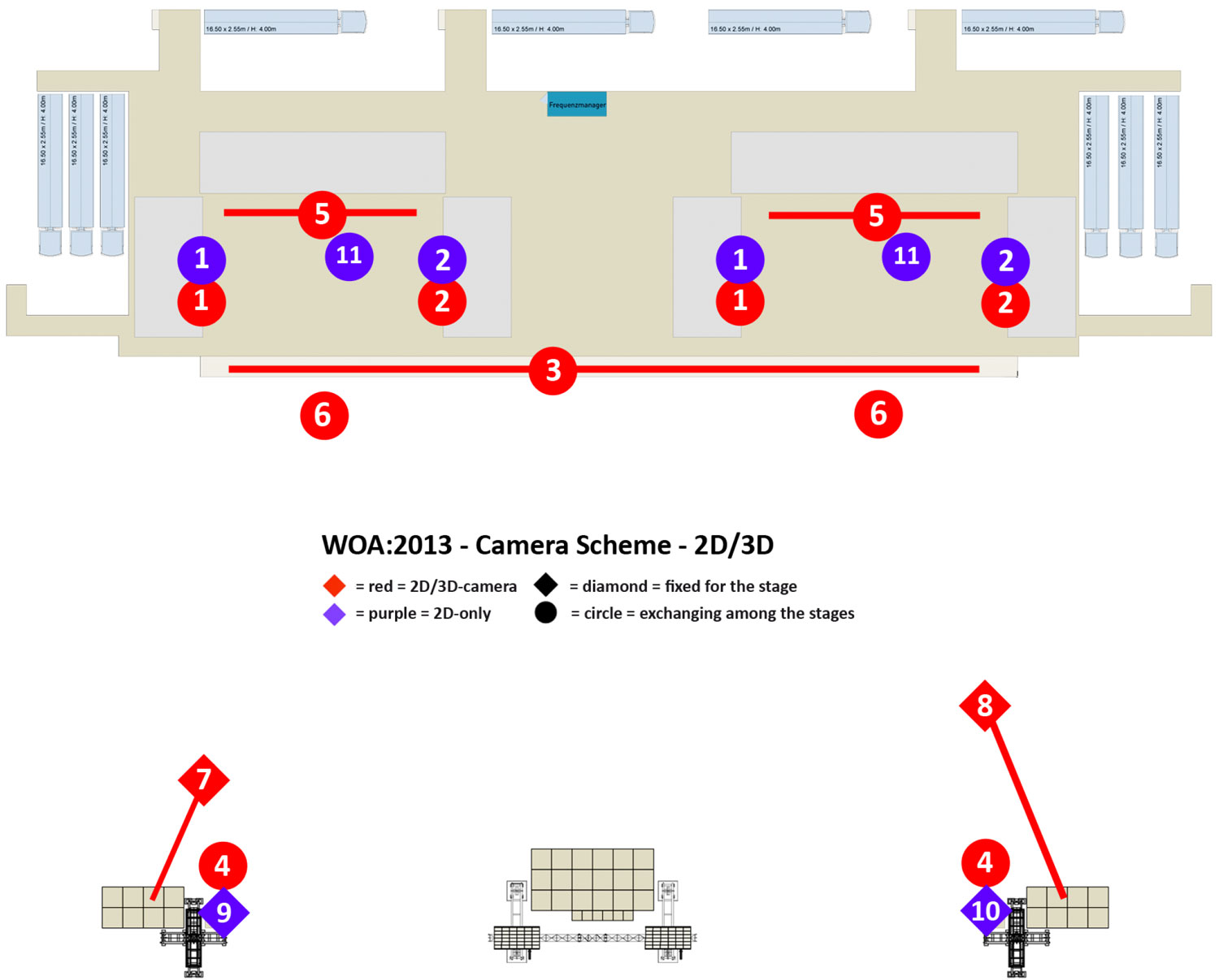 Vier Paare von Sony-HDC-1500 R/HB Kameras waren auf Spiegel-Rigs von Element Technica im Einsatz (auf Kran und Pumpstativen). Ein Stereo-Paar der LMP1200-Minikamera war auf einer Blackcam-Schiene hinter den Drummern unterwegs und drei Sony HDC-P1-Paare (eines davon auf einem Supertechno-Kran), sorgten für weitere dynamische und spektakuläre Stereo-3D Bilder.