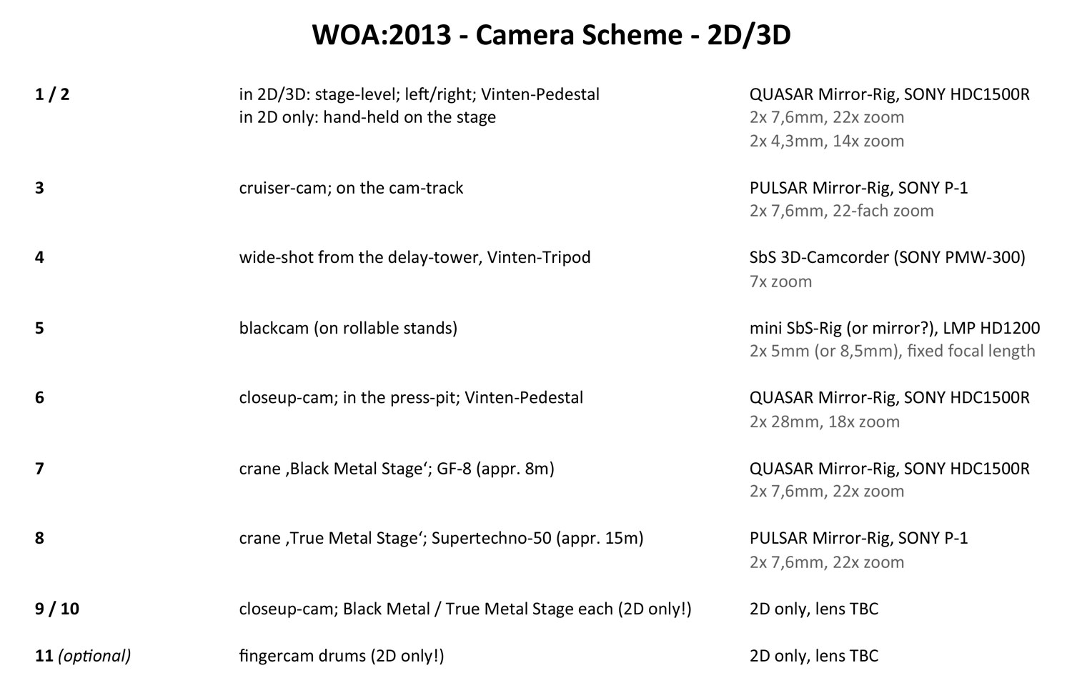 In Wacken waren insgesamt neun Stereo-Rigs für die Konzertproduktion und weitere Stereo-Kameras für die Akquise von zusätzlichem Material des Festivalgeländes im Einsatz. TopVision-Geschäftsführer Achim Jendges resümiert: »Mit der Stereo-3D-Produktion des Festivals in Wacken haben wir Neuland betreten und die technische Grenzen des Machbaren ausgelotet«.