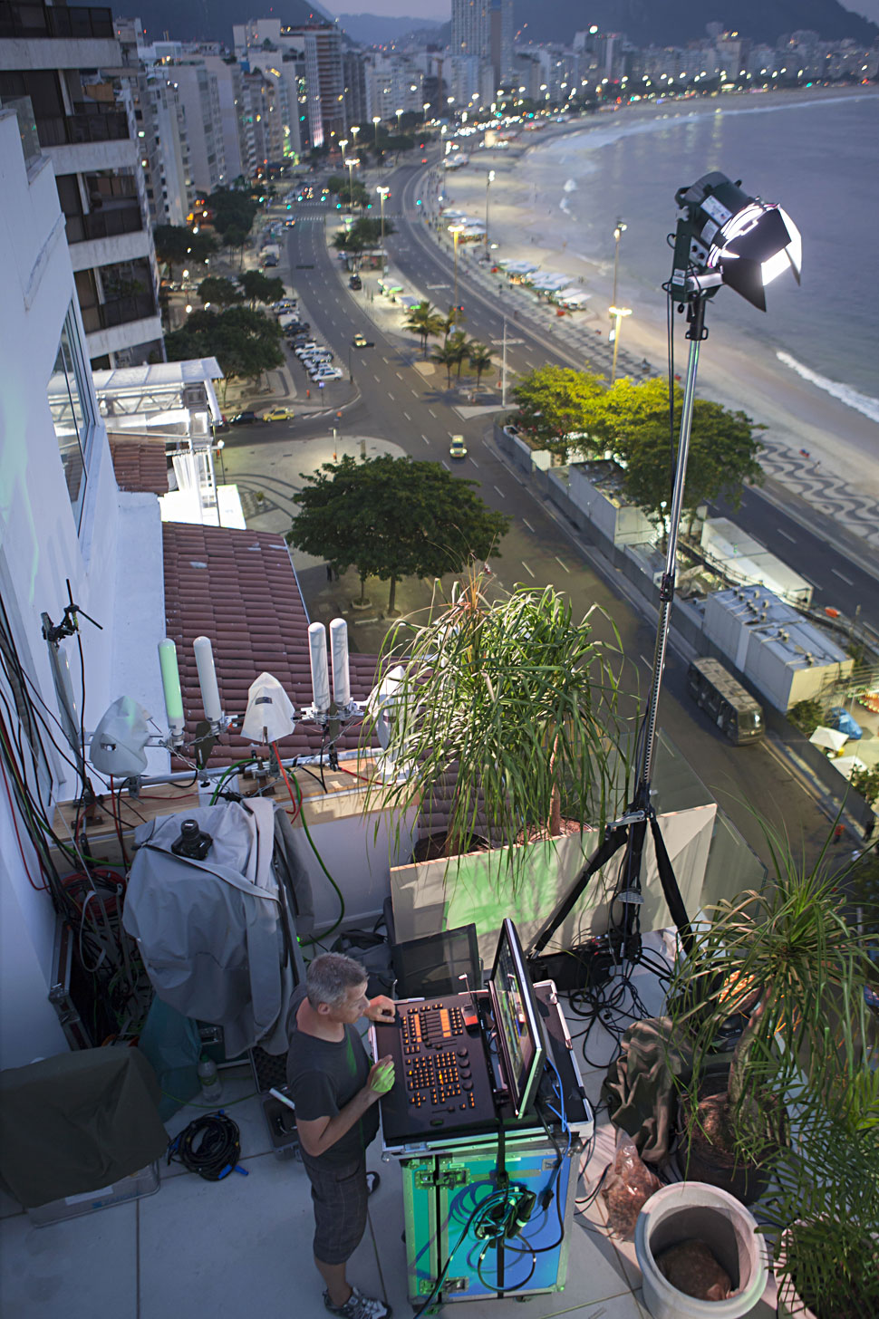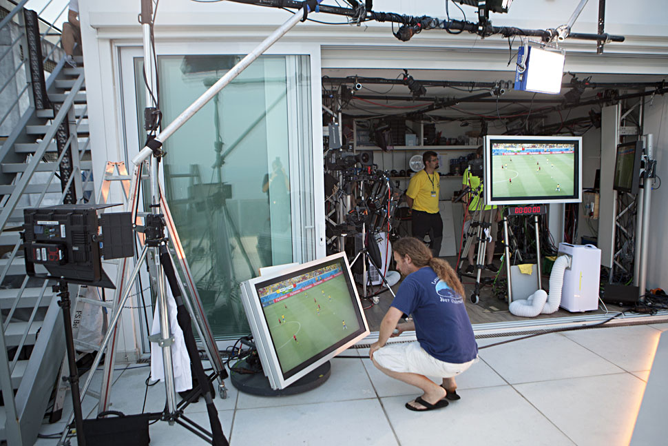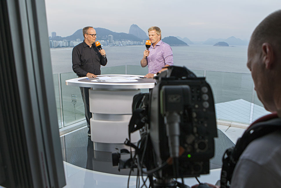 Dr. Bereczky: Wir haben bei der Fußball-Weltmeisterschaft in Brasilien schon eine sehr erfolgreiche Remote Production umgesetzt: Dort war die Regie 30 km von der Moderatoren-Plattform entfernt untergebracht. Das hat hervorragend funk­tioniert. Wir mussten das so machen, weil wir in der Wohnung, auf deren Dachterrasse die Moderatoren arbeiteten, schlichtweg keine Regie einbauen konnten. Glücklicherweise konnten wir auf eine sichere Stromversorgung vor Ort zugreifen, denn es waren auch andere Sender in der Nähe tätig. Dadurch hatten wir auch die nötige Sendesicherheit.