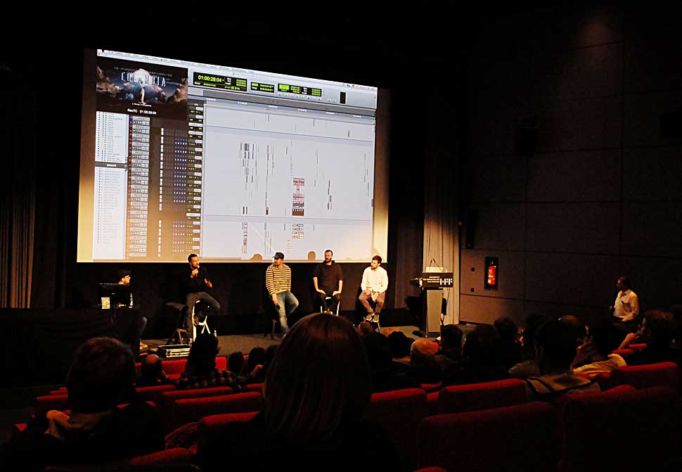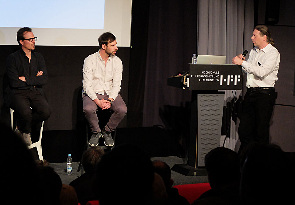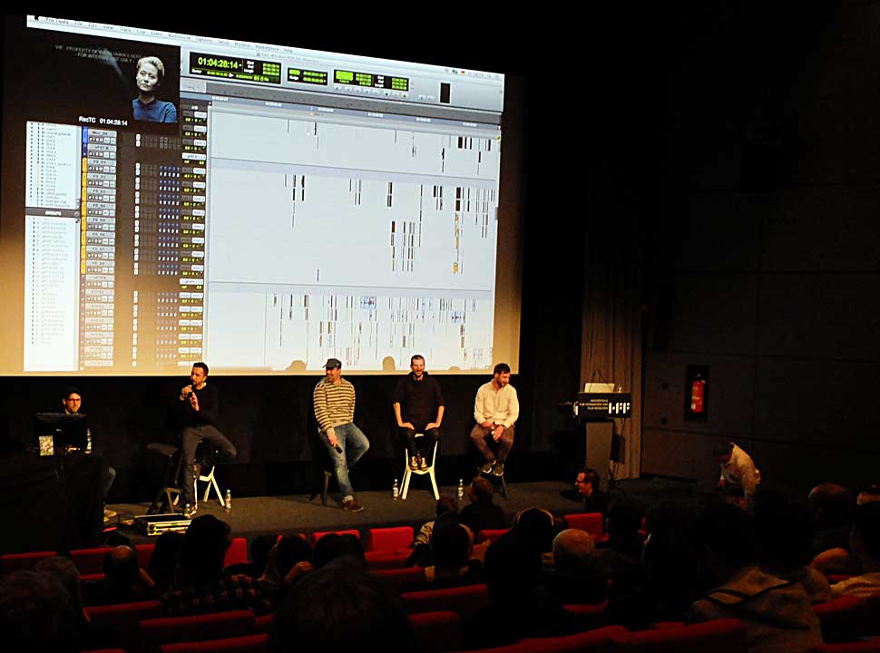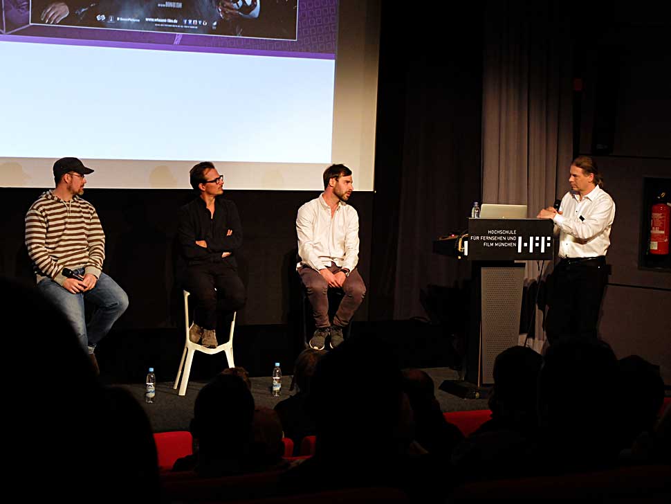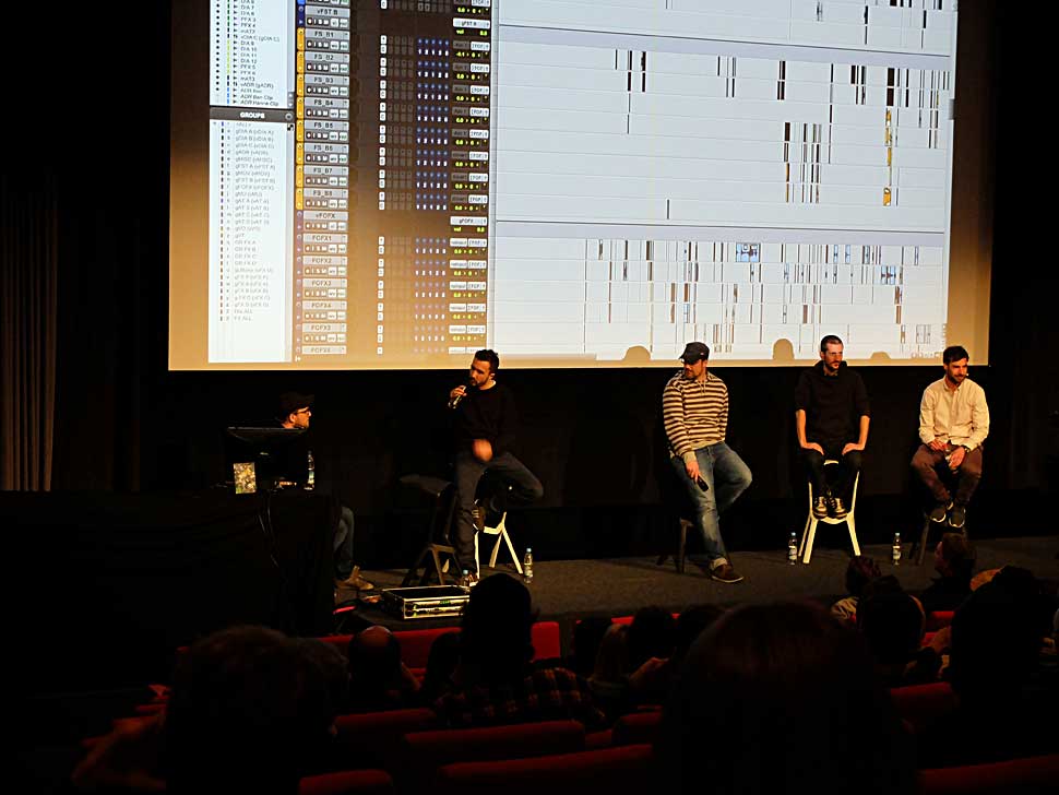 Auf dem Podium saßen Editor Robert Rzesacz, die Sounddesigner Daniel Weis und Florian Holzner, der Filmkomponist Michael Kamm sowie der Mischtonmeister von BasisBerlin, Ansgar Frerich.