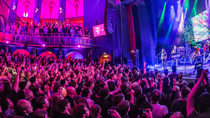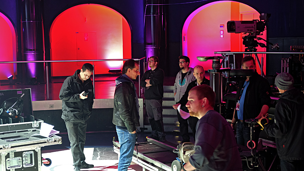 Der vergleichsweise kleine, für eine weltbekannte Band eher intime Veranstaltungsraum ließ nicht sehr viel Platz für die Übertragungstechnik. Die Band hatte selbst schon eine 10 m breite und 4 m hohe LED-Wand für die Bühnenshow mitgebracht, die natürlich einigen Platz auf der Bühne einnahm. So entschied sich Regisseur Schütrumpf bei den Kamera-Aufbauten im Saal für eine kompakte E-Dolly-Variante von TV Skyline, die mit einem motorisierten Gentle-Mote-Kamerakopf (Infos) ausgestattet und mit einer Ikegami-Broa­dcast-Kamera bestückt war. Weiter waren zwei Pumpstative rechts und links der Dolly-Schienen platziert, die auch durch vertikale Hubfahrten die Dynamik der Band aufgreifen konnten.