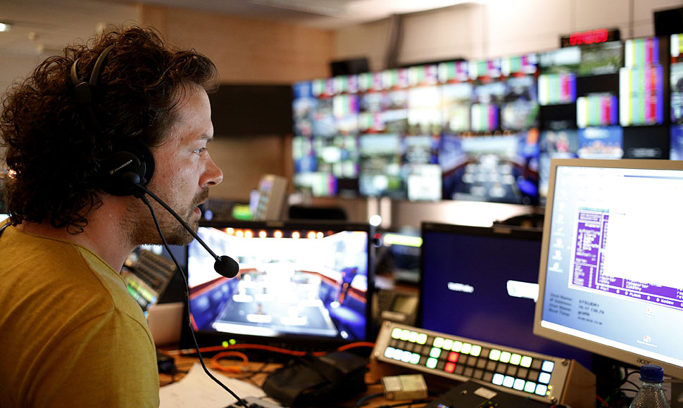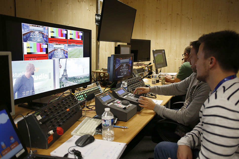 Im IBC in Paris ist nicht nur das Studio von ARD und ZDF untergebracht. Dort sitzt auch ein Großteil der Redaktion und auch die gesamte Schnitt-Infrastruktur mit zwölf Avid-Schnittplätzen mit angeschlossenen Audiomischplätzen ist im IBC installiert.Das gesamte Worldfeed-Material der Uefa kommt in der Senderegie im IBC an. Für den zentralen Materialtransfer und die Bearbeitung ist erneut eine Kombination aus EVS- und Avid-Isis-Equipment im Einsatz, mit 28 EVS-Kanälen. »Das Setup im IBC gleicht dem Aufbau der vergangenen Sport-Großveranstaltungen«, erklärt Vito Zoiro, Technischer Leiter des ZDF. Auf Seiten der ARD sind vier Avid-Schnittplätze in Betrieb, auf Seiten des ZDF acht.
