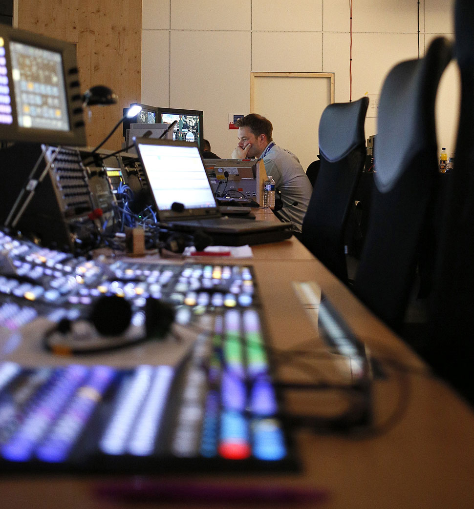 Für den Ton stehen zwei Tonregien zur Verfügung: Einmal die Studiotonregie und eine weitere für die Mischung des 5.1-Surround-Sounds, der anschließend nach Köln oder Mainz übertragen wird.