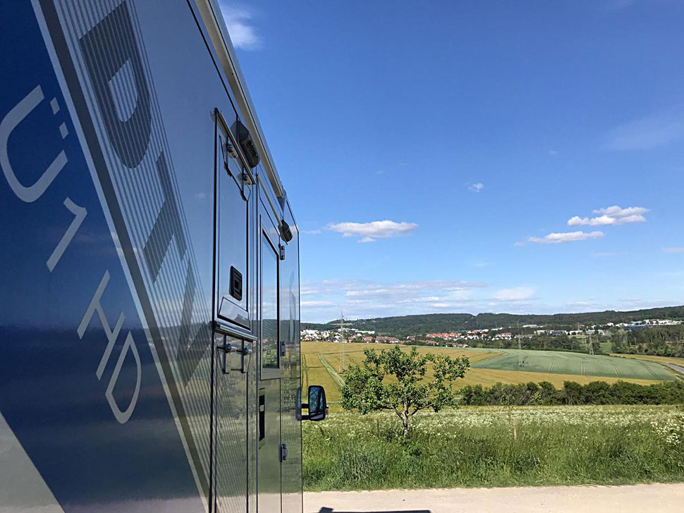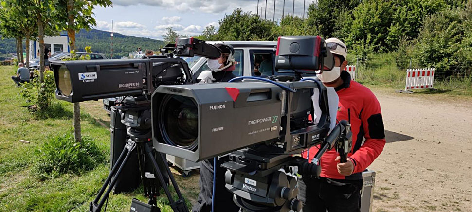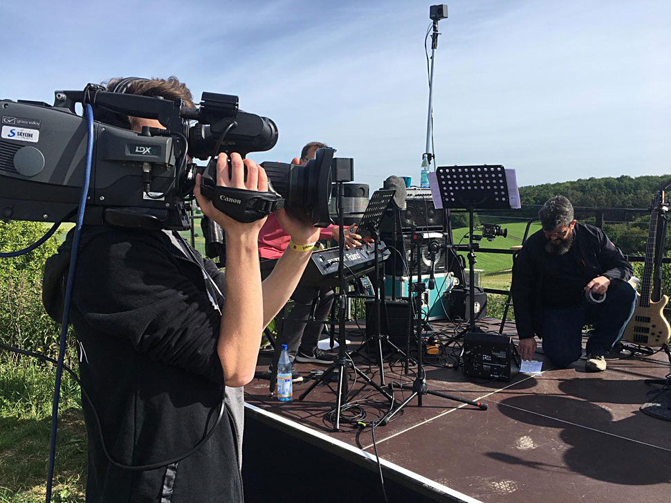 TV Skyline realisierte in deren Auftrag mit dem Ü1 die Produktion eines Gottesdienstes bei traumhafter Kulisse im Autokino Taunusstein. 120 Autos verfolgten den Gottesdienst über ihre UKW-Radios. Eine Live-Band mit fünf Musikern galt es ebenfalls in Szene zu setzen. »Wir konnten sogar Videozuspielungen der Besucher aus ihren Autos in den Livestream integrieren«, erzählt Robert Kis, Geschäftsführer TV Skyline.