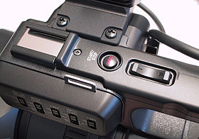 Wie es sich für einen professionellen Camcorder gehört, bietet der PD170 XLR-Buchsen für den Ton. Zwei davon sind am vorderen Ende des Tragegriffs von rechts zugänglich. Diese Position der Buchsen ist nicht wirklich praktisch, weil stets irgendwelche Stecker störend heraus stehen und Kabel lästig herunter hängen, sobald man externes Audio-Equipment anschließt.