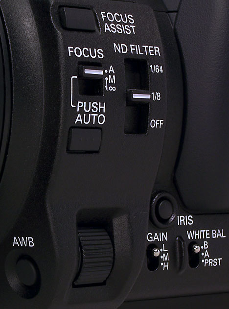 Besonders im HD-Modus ist es mit dem Sucher und dem Display schwer, zuverlässig manuell scharf zu stellen. Deshalb hat Panasonic eine Focus-Assist-Funktion in den HVX200 integriert, die hilft, die Schärfe im Sucher besser beurteilen und einstellen zu können. Dabei wird der mittlere Teil des Motivs in einem Fenster mit farbigem Rahmen vergrößert dargestellt. Diese Einstellhilfe ist wirklich nützlich und leicht zu handhaben.