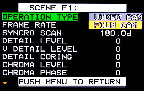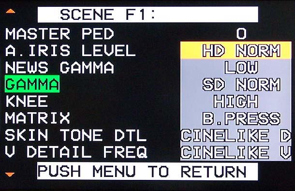 Ein weiteres Ausstattungs-Detail des HVX200, das vom DVX100A her bekannt ist, sind die sechs Scene-Files, die der Kameramann abrufen, bei Bedarf aber auch individuell anpassen kann. Wie der 100er bietet auch der 200er dabei zahlreiche Möglichkeiten, ins Bild einzugreifen und etwa Gamma, Knie oder Chroma anzupassen. Selbst die Farbmatrix lässt sich mit vier vorgegebenen Programmen anpassen. Ebenfalls schön und mittlerweile auch bei Camcordern in dieser Klasse gut eingeführt, sind die User-Tasten, die sich mit Funktionen wie ATW, Backlight, Gain oder ähnlichem belegen lassen. Der HVX200 bietet gleich drei davon, was beim Drehen sehr nützlich ist. Der Camcorder bietet außerdem einen Slot für eine SD-Karte, auf der sich etwa Scene-Files speichern und aufrufen lassen.