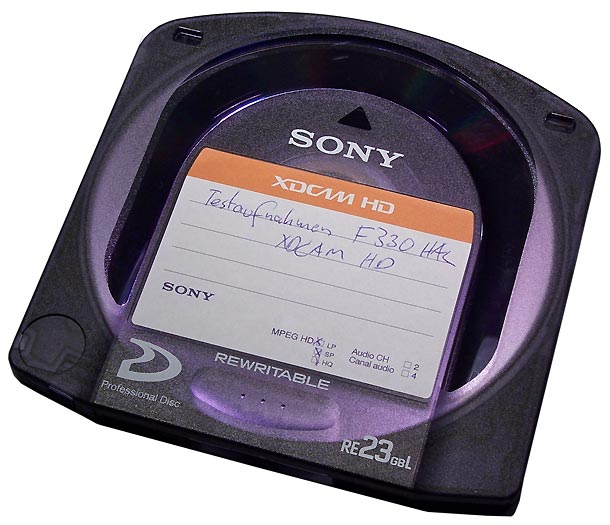 XDCAM HD und somit auch der F330 nutzt als Aufzeichnungsmedium die Professional Disc von Sony, die auch schon beim in SD arbeitenden XDCAM-Format zum Einsatz kommt. Die Scheibe wird mit einem Verfahren beschrieben, das demjenigen gleicht, das für die Blu-ray Disc festgelegt wurde (mehr Infos zu XDCAM HD allgemein finden Sie hier, eine Übersicht verschiedener Digitalformate steht hier bereit).