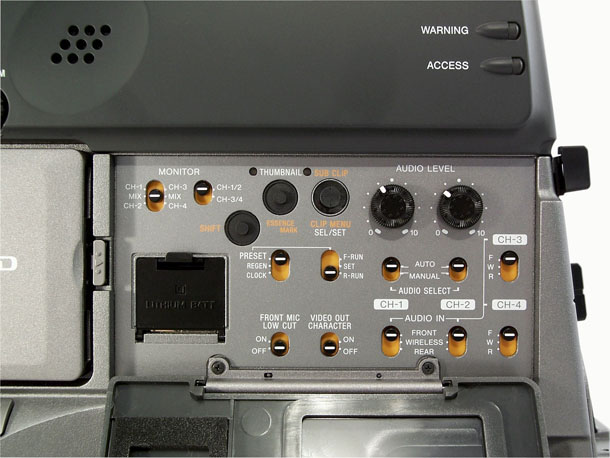 Am hinteren Bedienfeld werden wie bei allen vergleichbaren Camcordern die Timecode- und Audio-Einstellungen vorgenommen. Neu ist hier die Möglichkeit, die optionalen Tonkanäle 3 und 4 über Schalter mit einem der drei Toneingänge zu belegen. Während ein externer Stereomischer auf Kanal 1 und 2 aufgezeichnet wird, kann damit auf Kanal 3 ein intern verkoppeltes Funkmikrofon und auf Kanal 4 das Kameramikrofon aufgezeichnet werden.