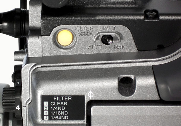 Die drei 1/2-Zoll-CCDs sind — wie üblich — für Kunstlicht sensibilisiert. Die Filterung für Tageslicht wird aber beim F330 anders als etwa beim BVW-300/400 oder DVW-700 — an der Bestückung des Filterrads schon zu erkennen — rein elektronisch vorgenommen, ganz so, wie das auch bei Consumer-Camcordern üblich ist. Am schnellsten geht die Umstellung auf Tageslicht mit dem Druckknopf »Filter 5.600 K« auf der linken Kameraseite, direkt neben der Sucherbefestigung. Steht der Weißabgleichschalter auf »Preset«, kann dieser Tageslichtschalter benutzt werden, um direkt von Kunstlicht mit einer Farbtemperatur von 3.200 K auf Tageslicht mit 5.600 K zu wechseln. Ist der Camcorder auf Tageslicht geschaltet, leuchtet der Druckknopf.