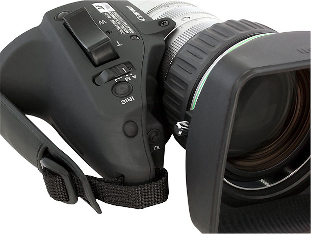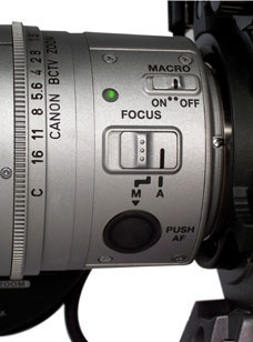 Das Canon VCL719BXS ist ein kostengünstiger HD-Zoom ohne besondere Raffinesse, und sieht auf den ersten Blick — bis auf die silberne Gehäusefarbe — aus, wie jedes normale ENG-Zoomobjektiv. Auf den zweiten Blick fallen die Unterschiede zu den bisher üblichen Profi-Objektiven ins Auge, die teilweise Kompromisse in der Bedienung verlangen, die bislang in dieser Camcorder-Klasse ungewohnt sind: Der Schärfering des VCL719BXS hat keinen Anschlag, kann also endlos gedreht werden. Es gibt auch keinen Einstellring fürs Auflagemaß (Backfocus) und kein Kabel zwischen Camcorder und Objektiv. Die Optik nimmt über integrierte Kontakte Verbindung mit dem Camcorder auf. Auf dem Objektiv finden sich zwei On/Off-Schiebeschalter für Autofokus und Macro sowie ein Druckknopf für einmaliges Scharfstellen per AF-Taste.